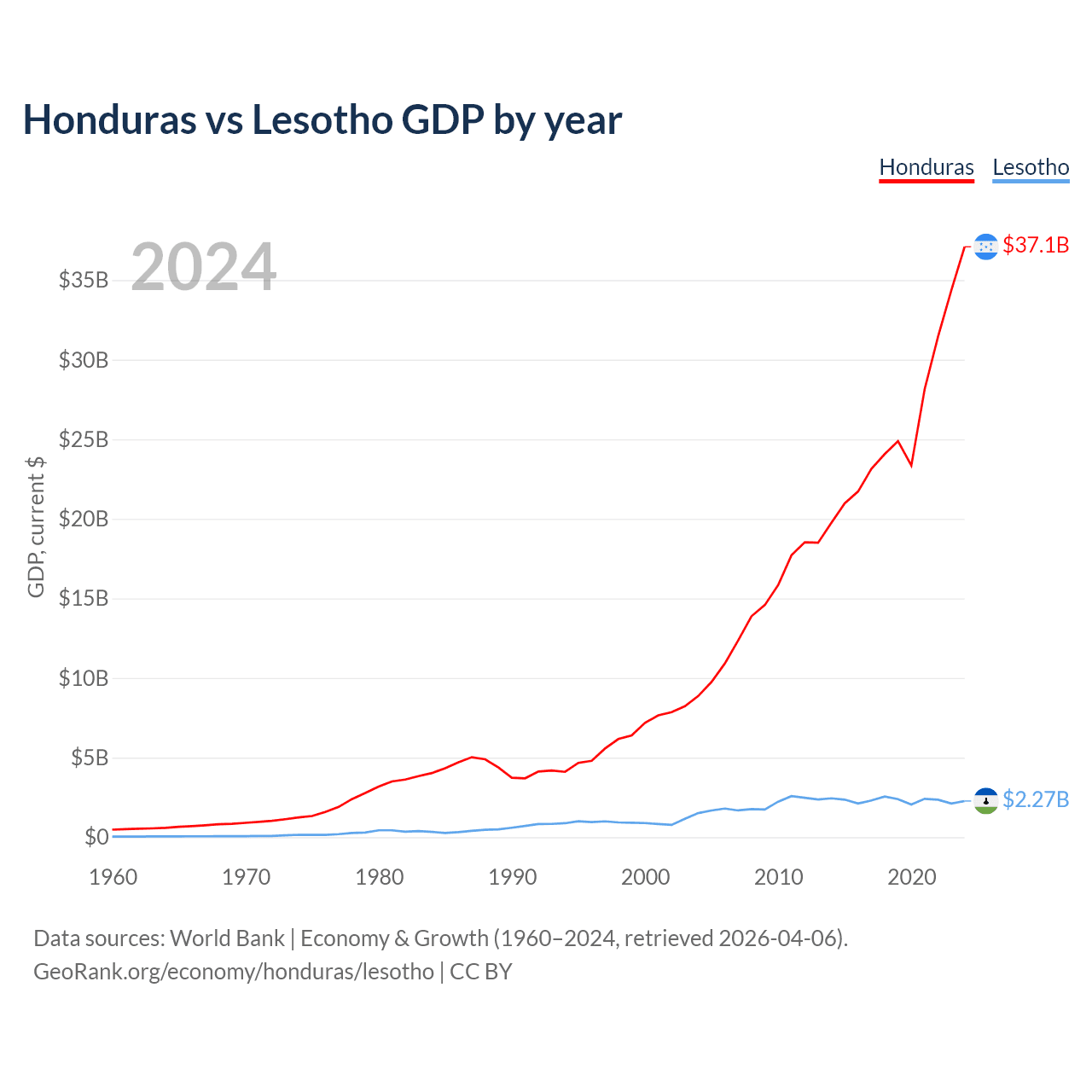 Honduras has a GDP of $37.1B compared to $2.27B for Lesotho, ranking 104/197 and 175/197 by economy size, respectively.