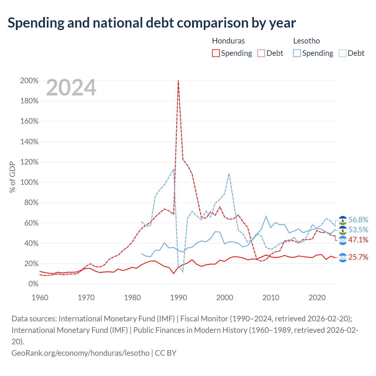 Honduras has $17.5B in government debt (47.1% of GDP), compared to $1.29B (56.8% of GDP) in Lesotho.