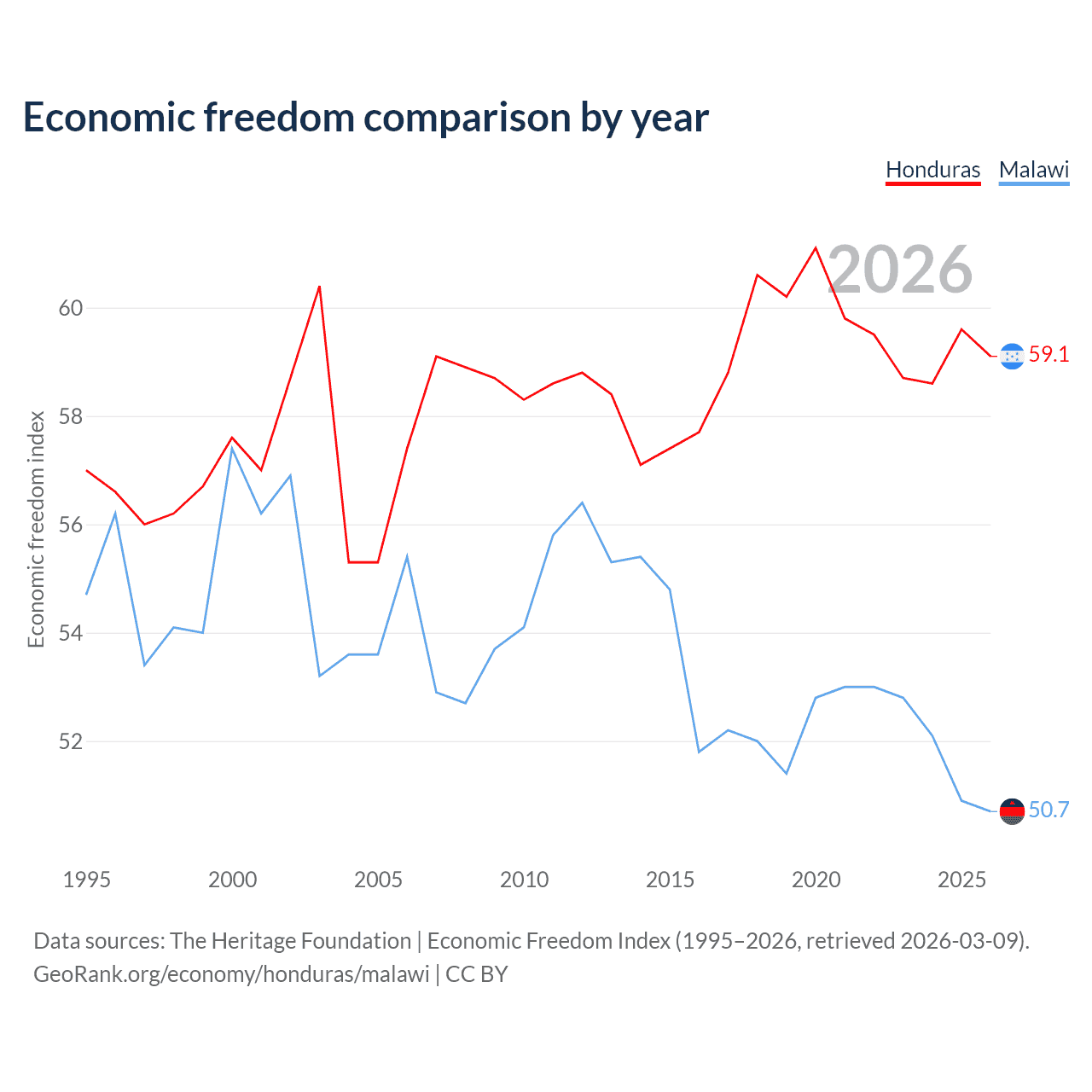 The Economic Freedom Index for Honduras is 59.1, ranking 105/197, compared to 50.7 for Malawi, ranking 159/197. The chart above displays a comparison of annual changes in economic freedom indexes.