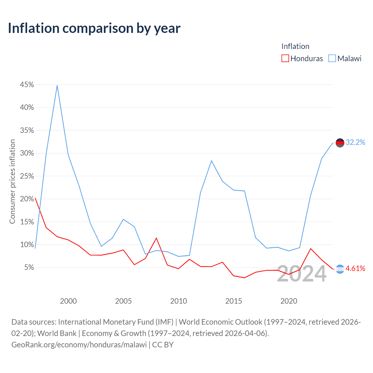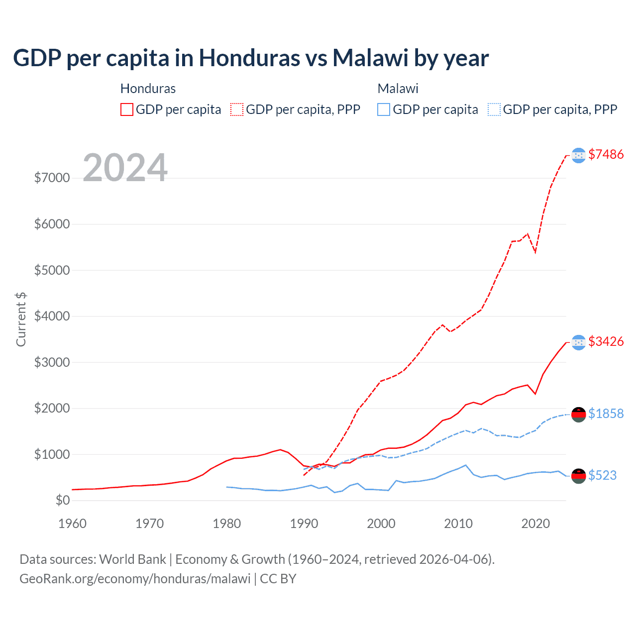 Honduras has a GDP of $37.1B compared to $11.3B for Malawi, ranking 104/197 and 151/197 by economy size, respectively.