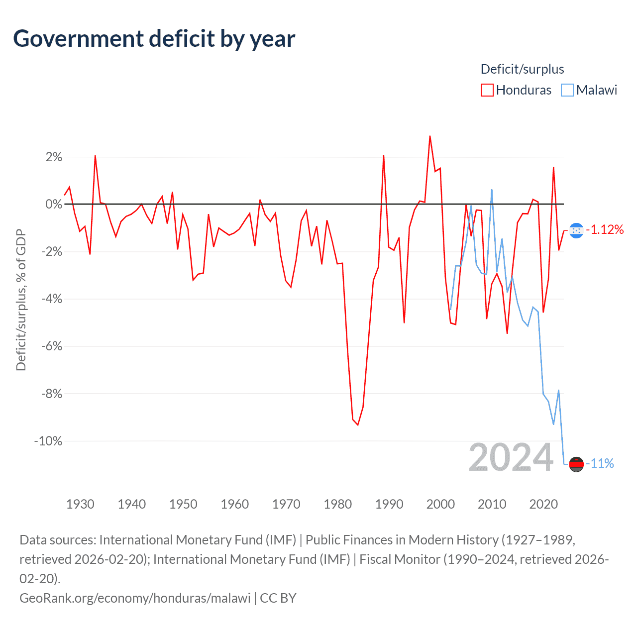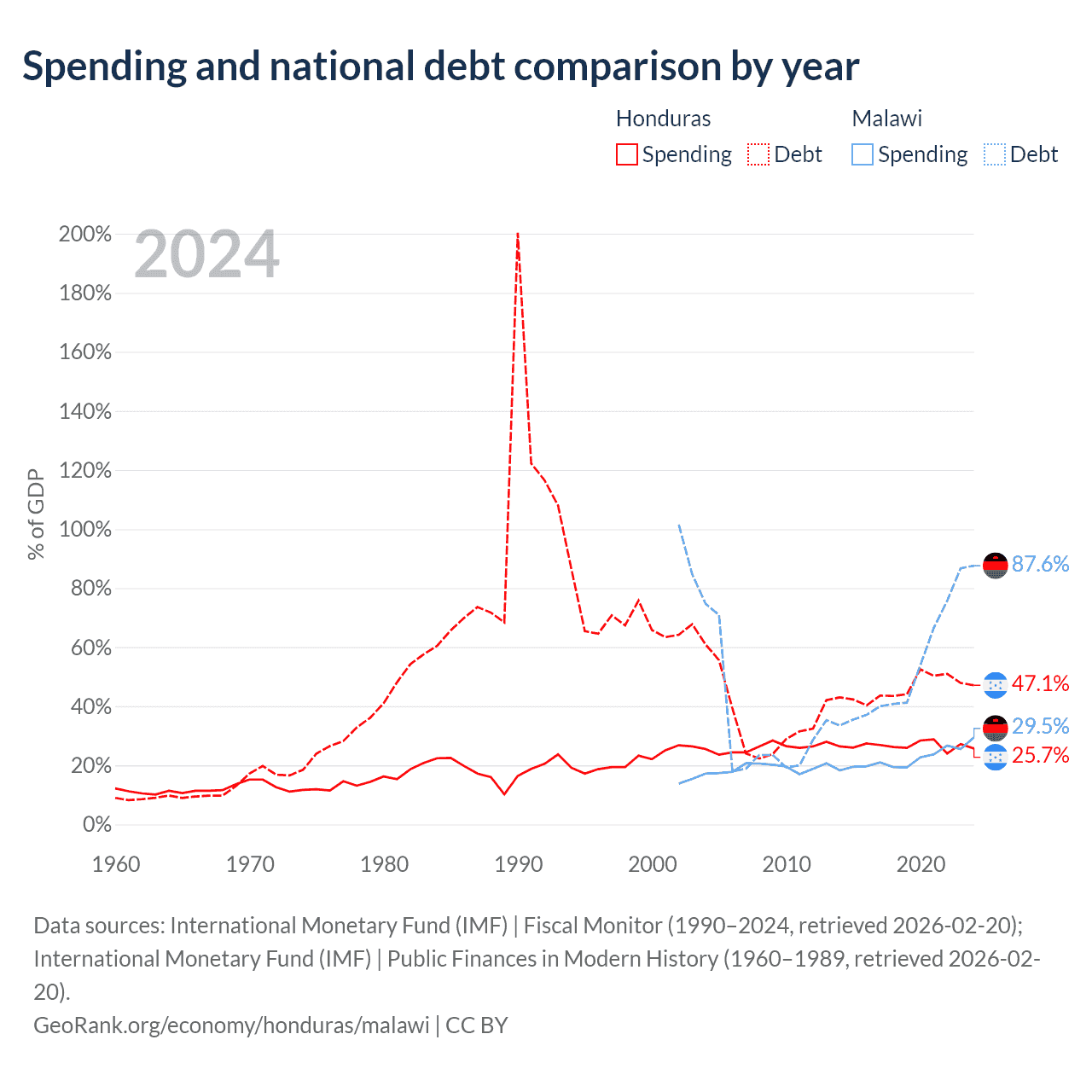 Honduras has $17.5B in government debt (47.1% of GDP), compared to $9.91B (87.6% of GDP) in Malawi.