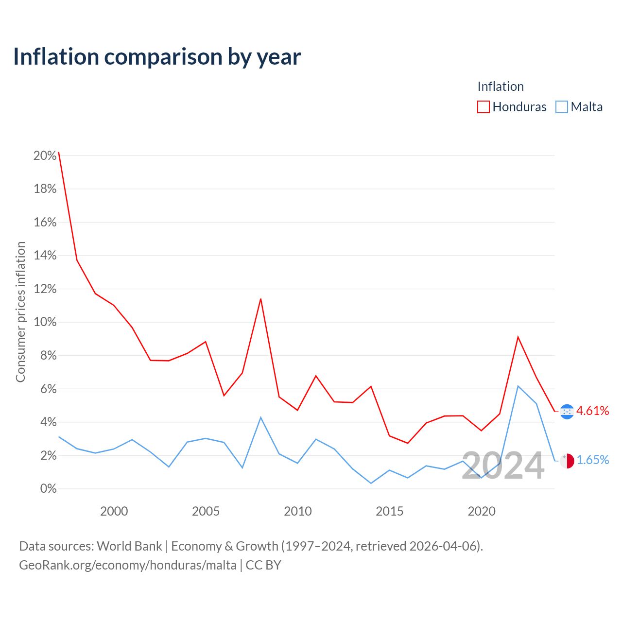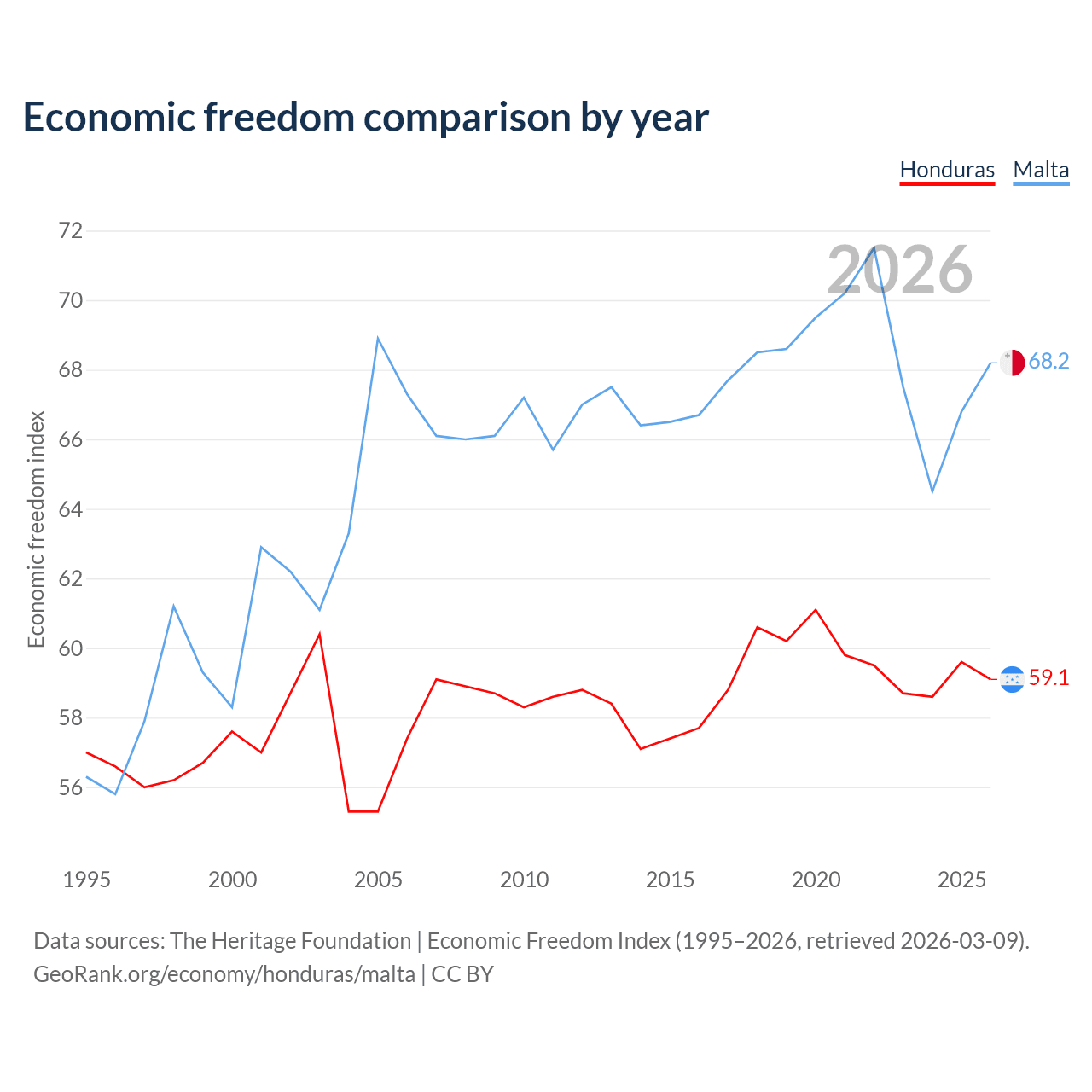 The Economic Freedom Index for Honduras is 59.1, ranking 105/197, compared to 68.2 for Malta, ranking 49/197. The chart above displays a comparison of annual changes in economic freedom indexes.