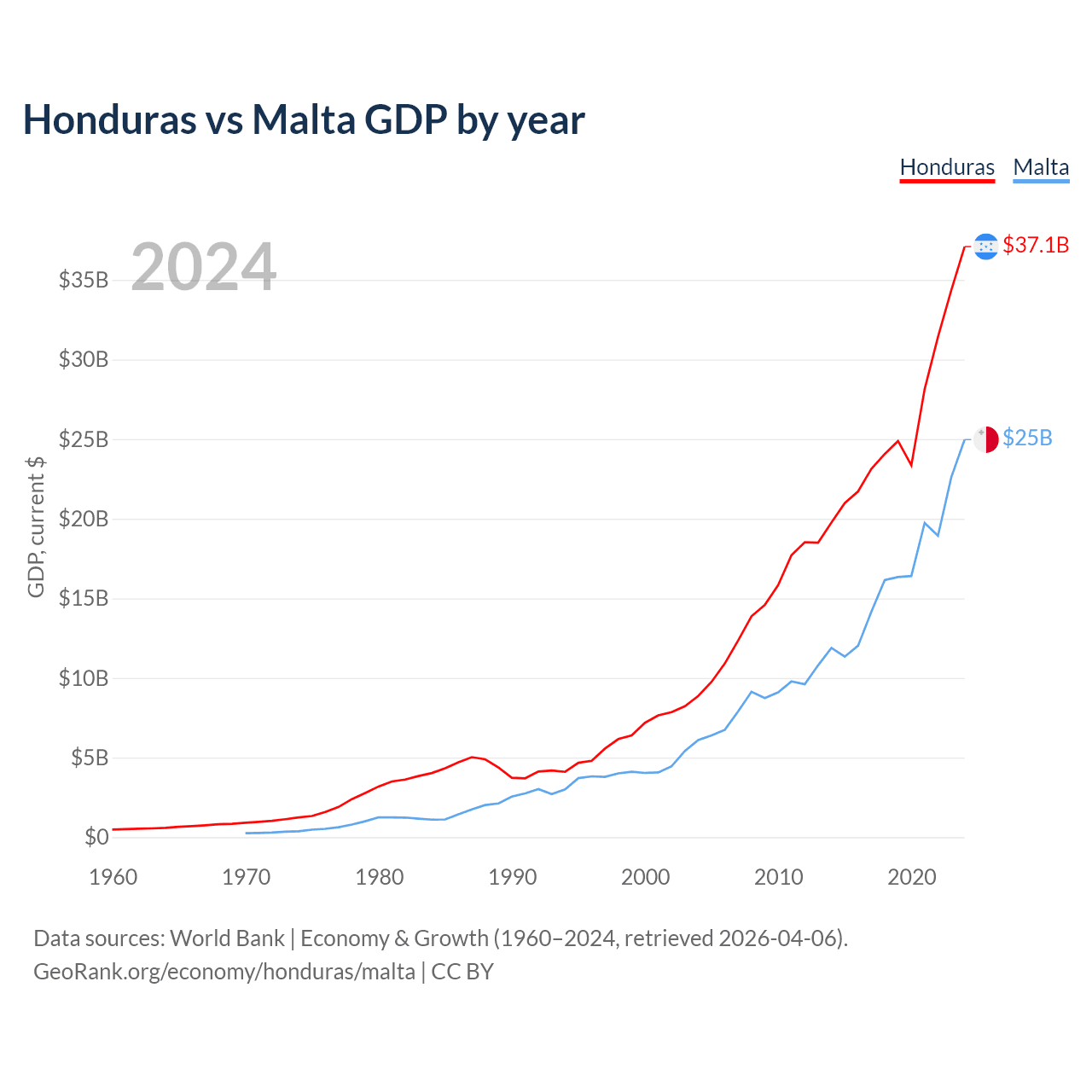Honduras has a GDP of $37.1B compared to $25B for Malta, ranking 104/197 and 119/197 by economy size, respectively.