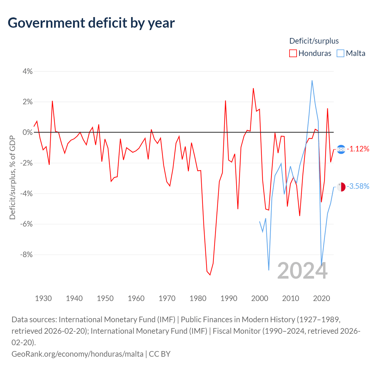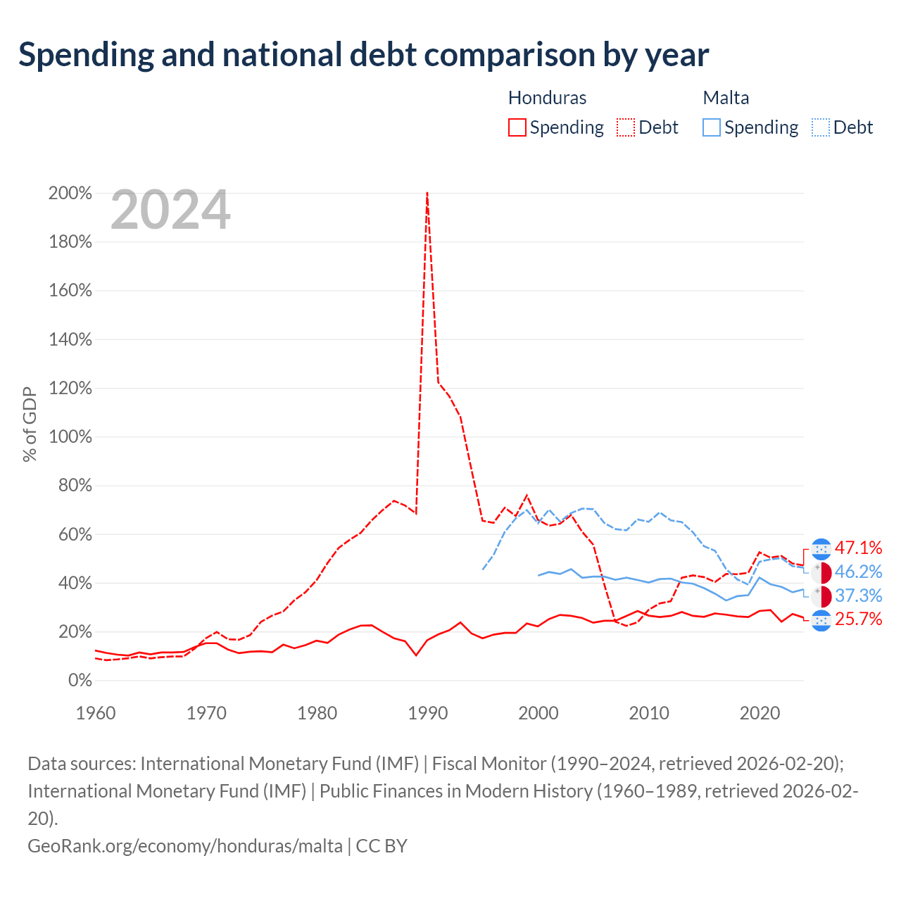 Honduras has $17.5B in government debt (47.1% of GDP), compared to $11.5B (46.2% of GDP) in Malta.
