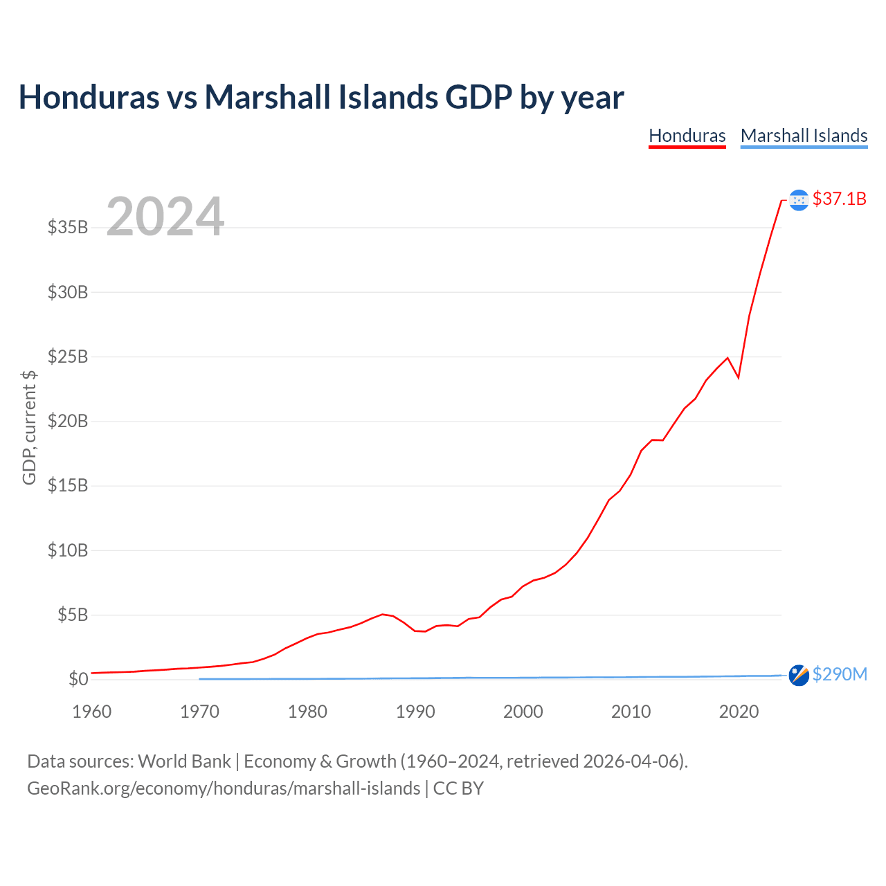 Honduras has a GDP of $37.1B compared to $290M for the Marshall Islands, ranking 104/197 and 193/197 by economy size, respectively.