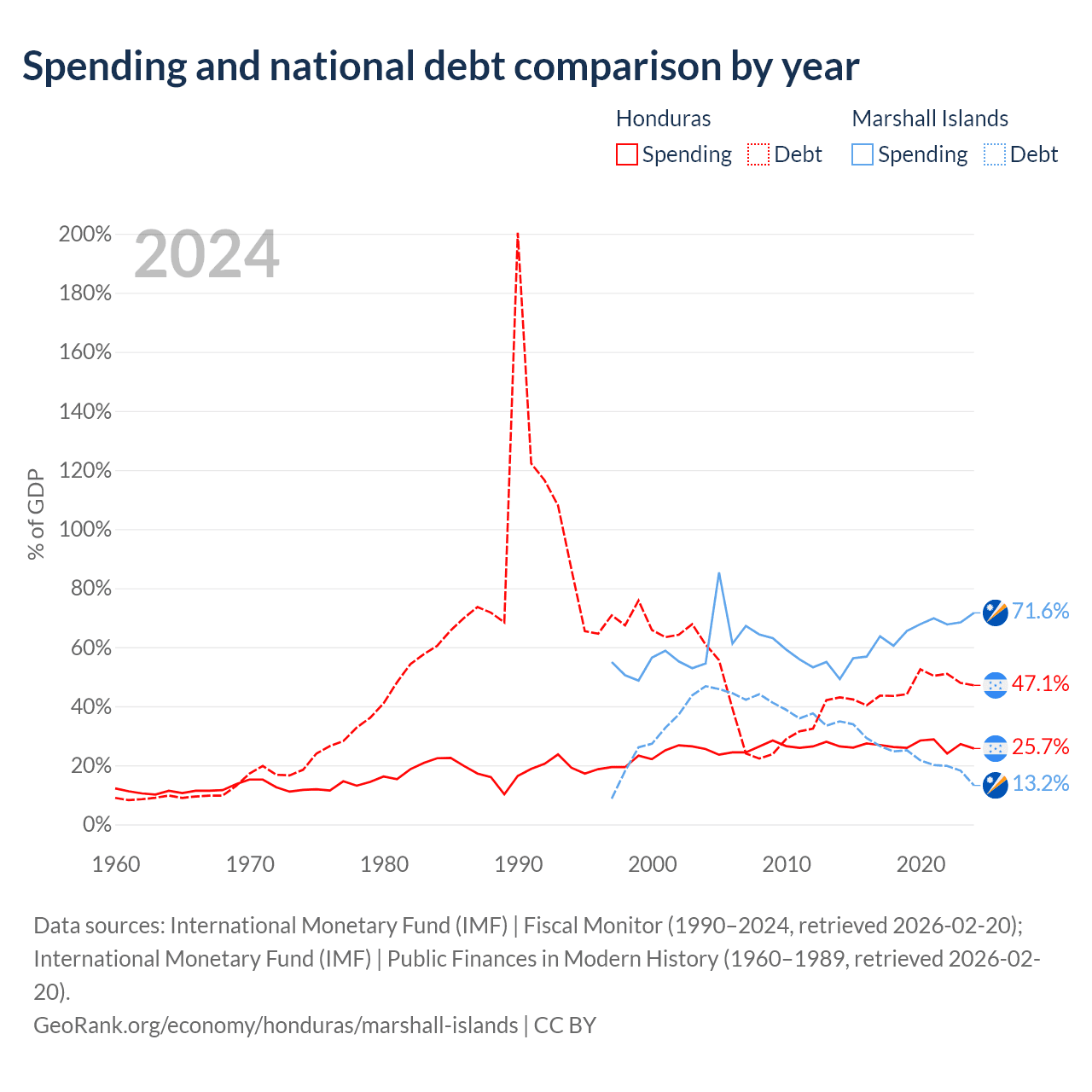Honduras has $17.5B in government debt (47.1% of GDP), compared to $38.4M (13.2% of GDP) in the Marshall Islands.