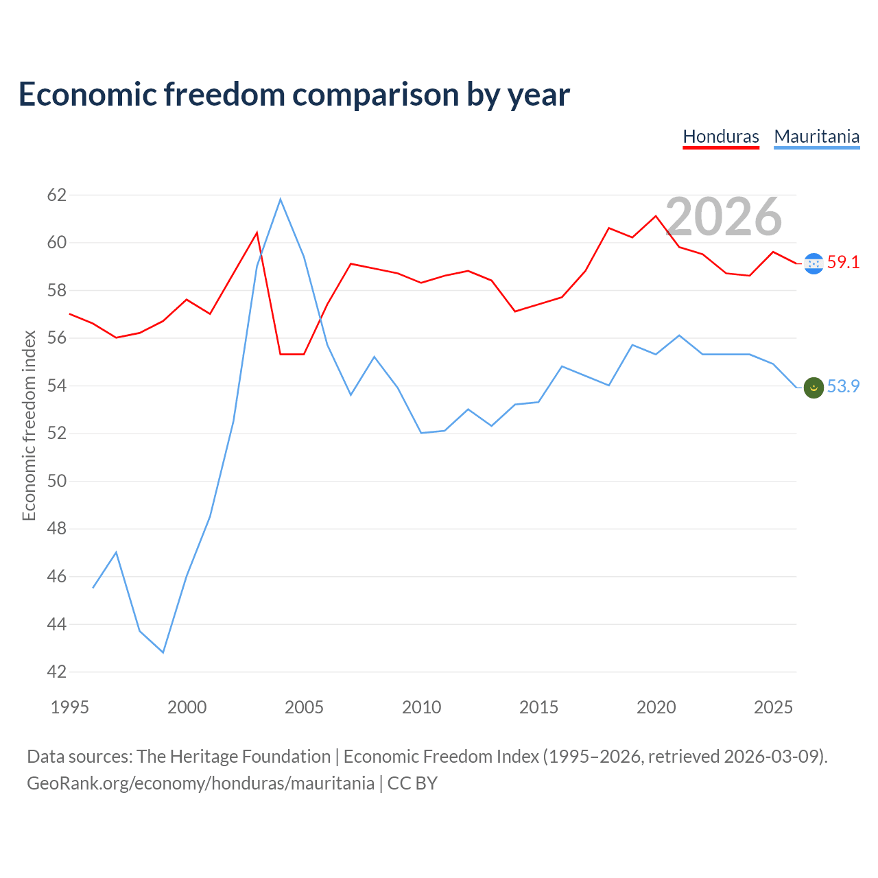 The Economic Freedom Index for Honduras is 59.1, ranking 105/197, compared to 53.9 for Mauritania, ranking 136/197. The chart above displays a comparison of annual changes in economic freedom indexes.