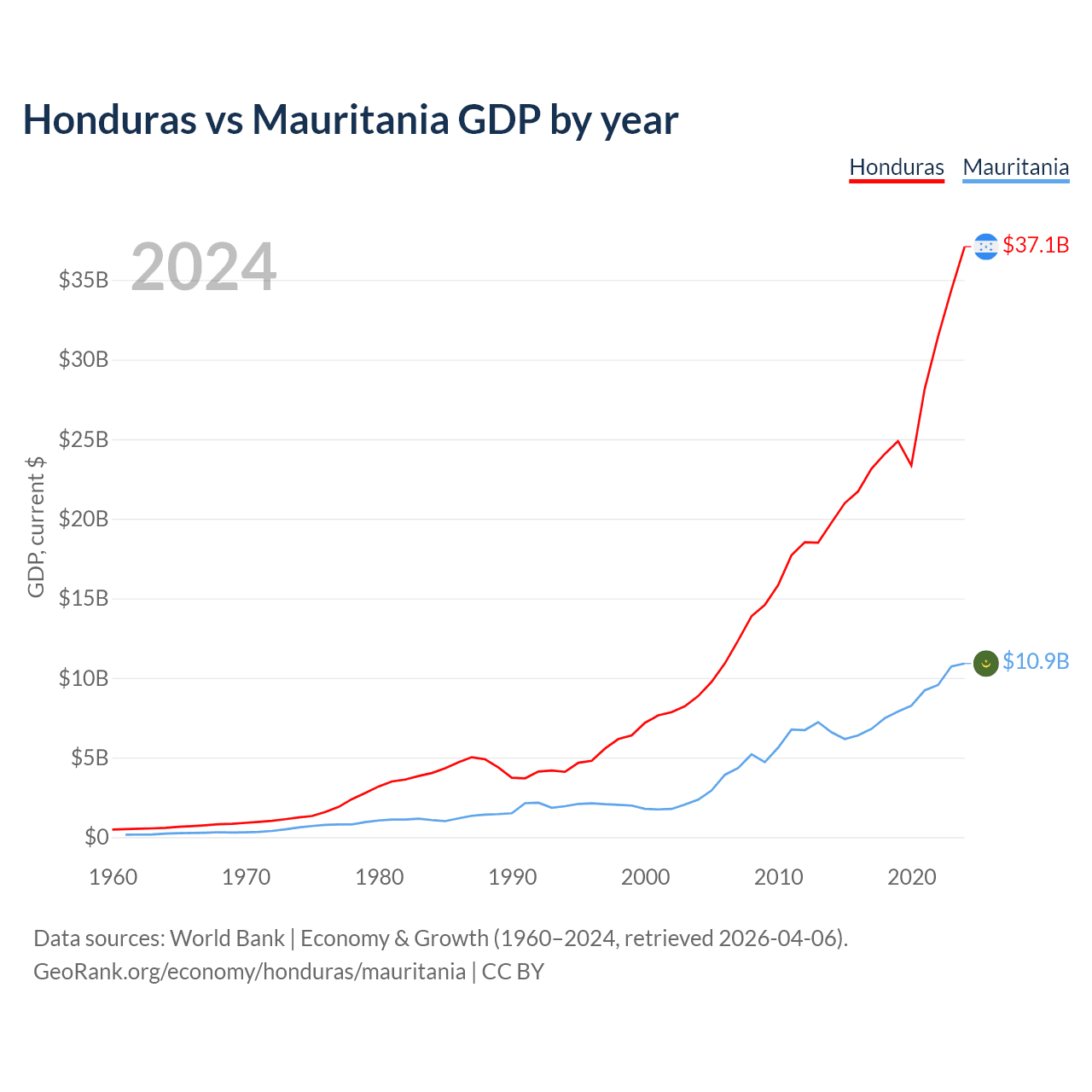 Honduras has a GDP of $37.1B compared to $10.9B for Mauritania, ranking 104/197 and 153/197 by economy size, respectively.
