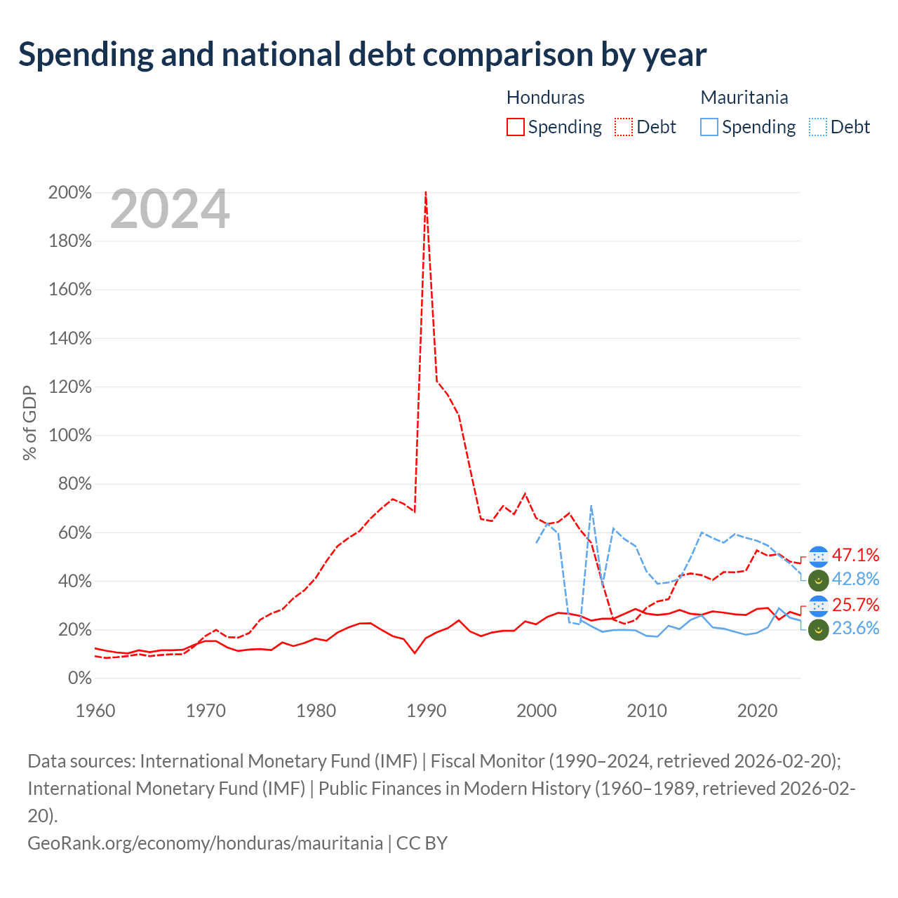 Honduras has $17.5B in government debt (47.1% of GDP), compared to $4.67B (42.8% of GDP) in Mauritania.