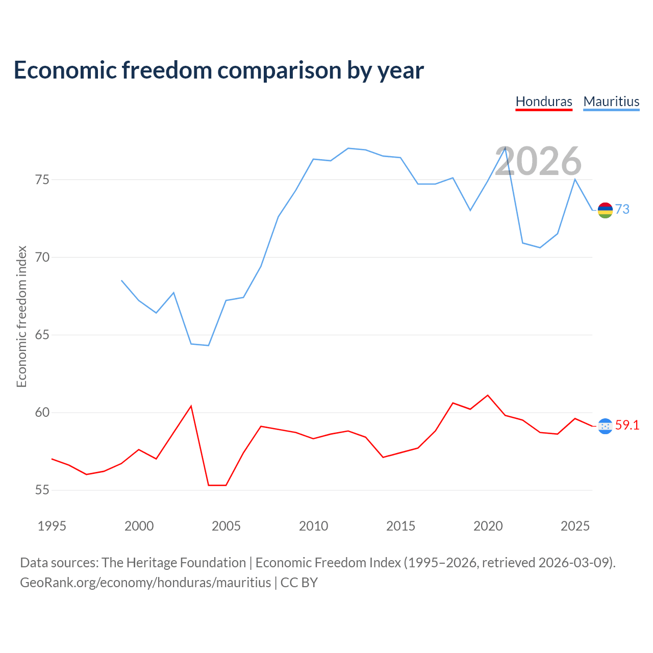 The Economic Freedom Index for Honduras is 59.1, ranking 105/197, compared to 73 for Mauritius, ranking 26/197. The chart above displays a comparison of annual changes in economic freedom indexes.