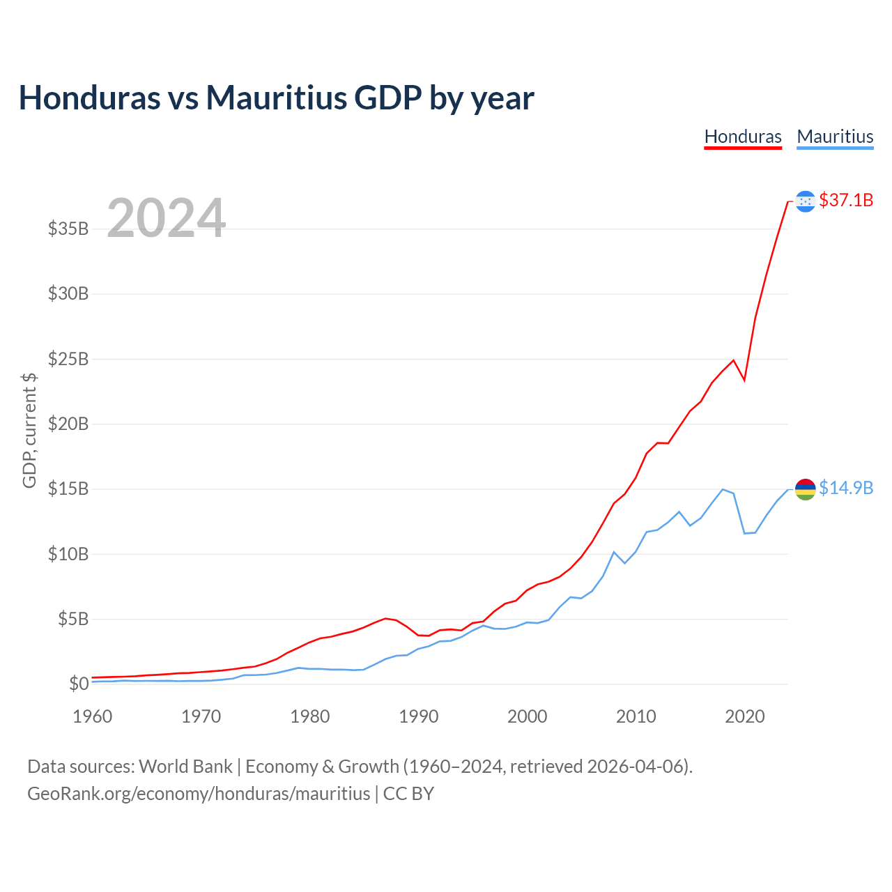 Honduras has a GDP of $37.1B compared to $14.9B for Mauritius, ranking 104/197 and 143/197 by economy size, respectively.