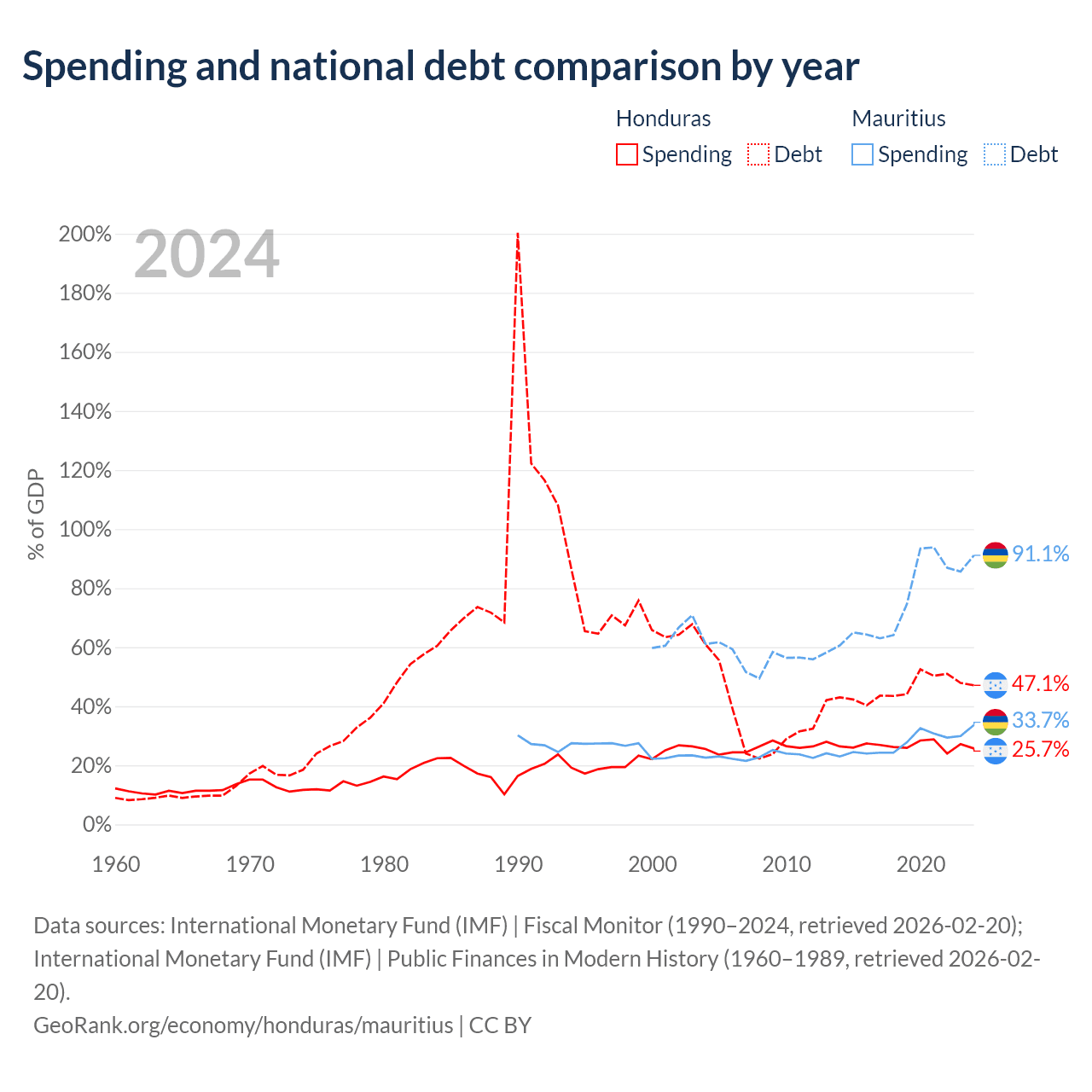 Honduras has $17.5B in government debt (47.1% of GDP), compared to $13.6B (91.1% of GDP) in Mauritius.