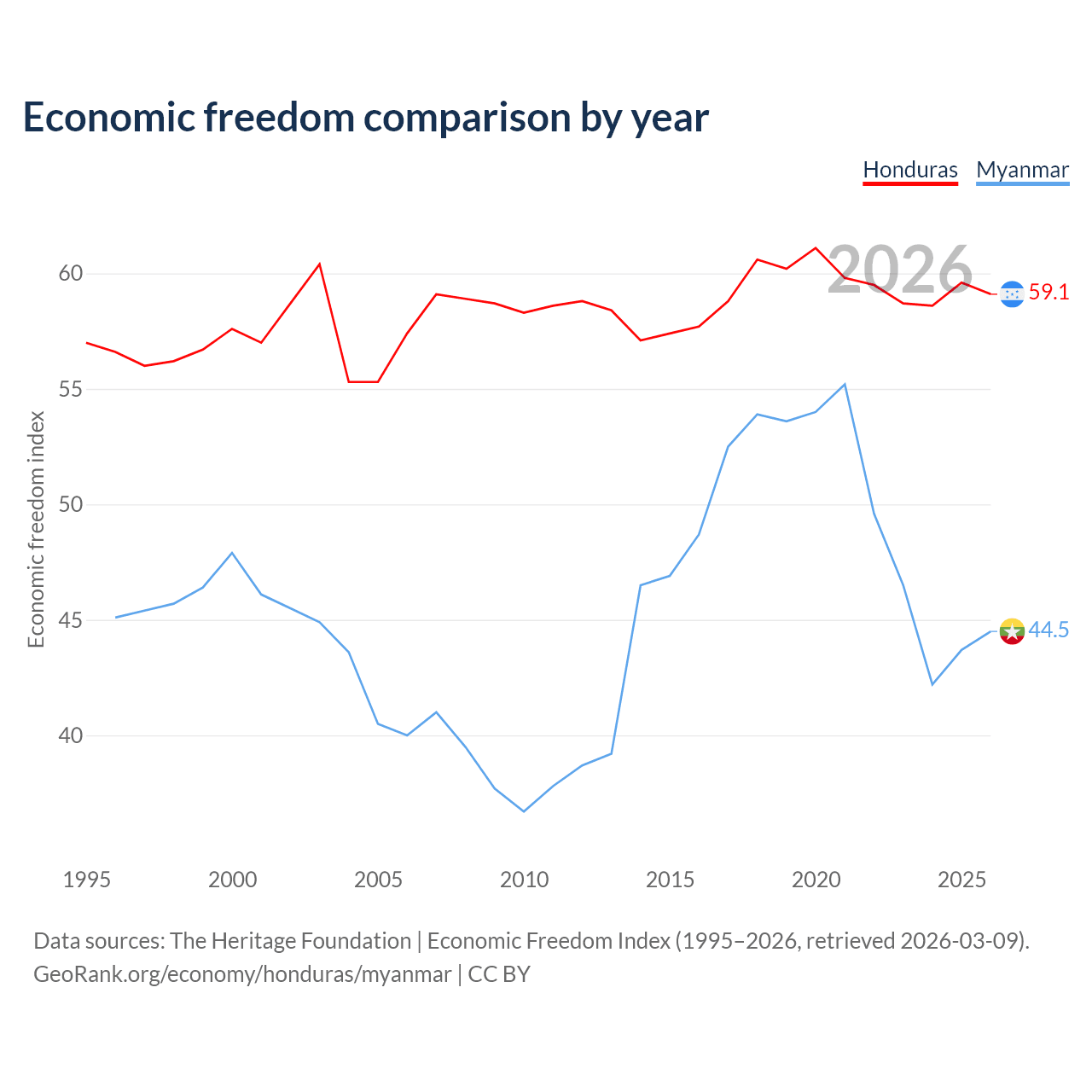 The Economic Freedom Index for Honduras is 59.1, ranking 105/197, compared to 44.5 for Myanmar, ranking 180/197. The chart above displays a comparison of annual changes in economic freedom indexes.