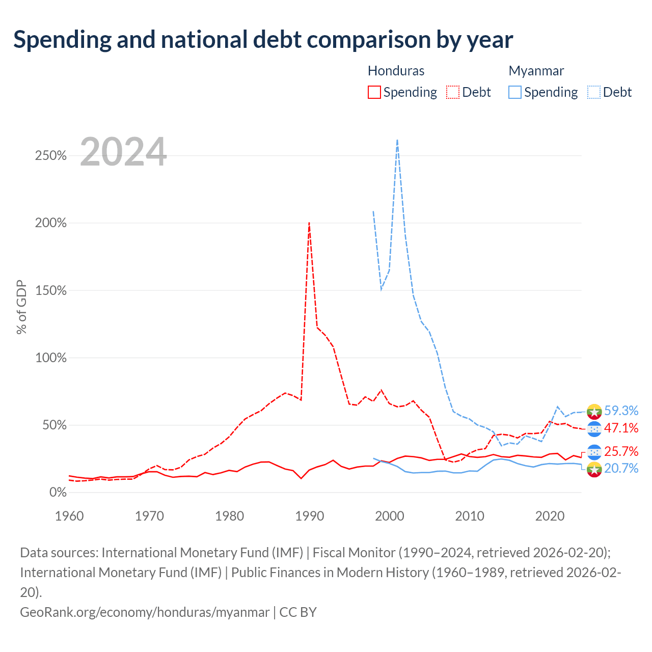 Honduras has $17.5B in government debt (47.1% of GDP), compared to $44B (59.3% of GDP) in Myanmar.