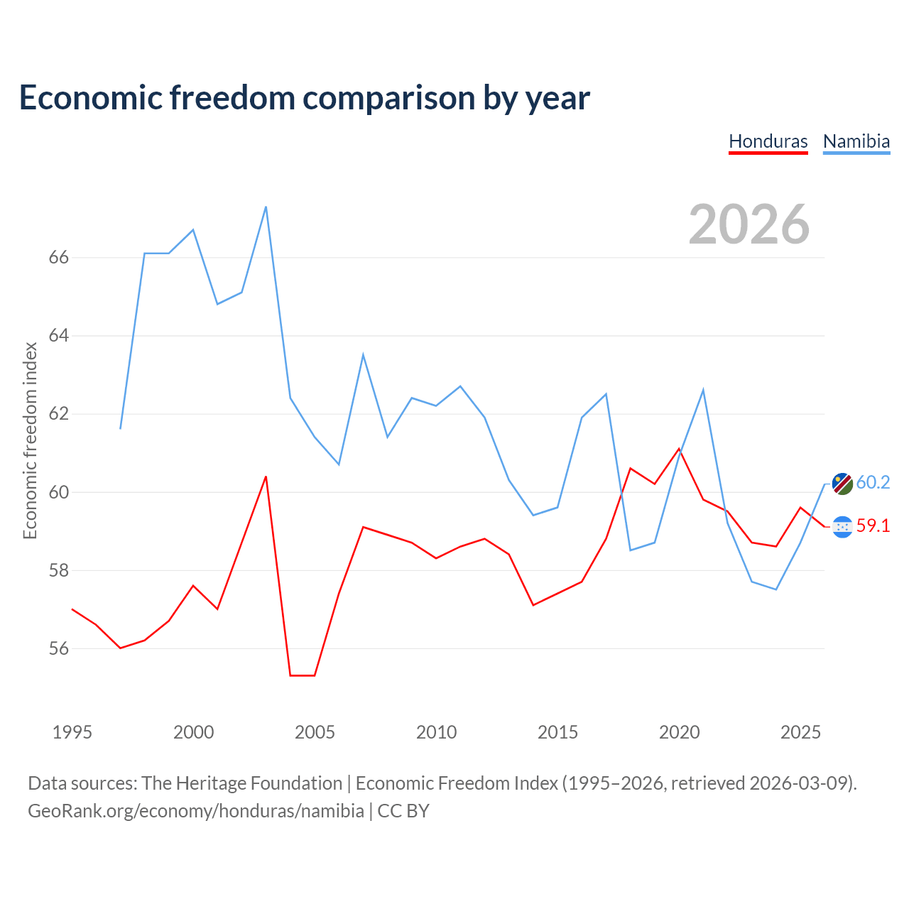 The Economic Freedom Index for Honduras is 59.1, ranking 105/197, compared to 60.2 for Namibia, ranking 95/197. The chart above displays a comparison of annual changes in economic freedom indexes.