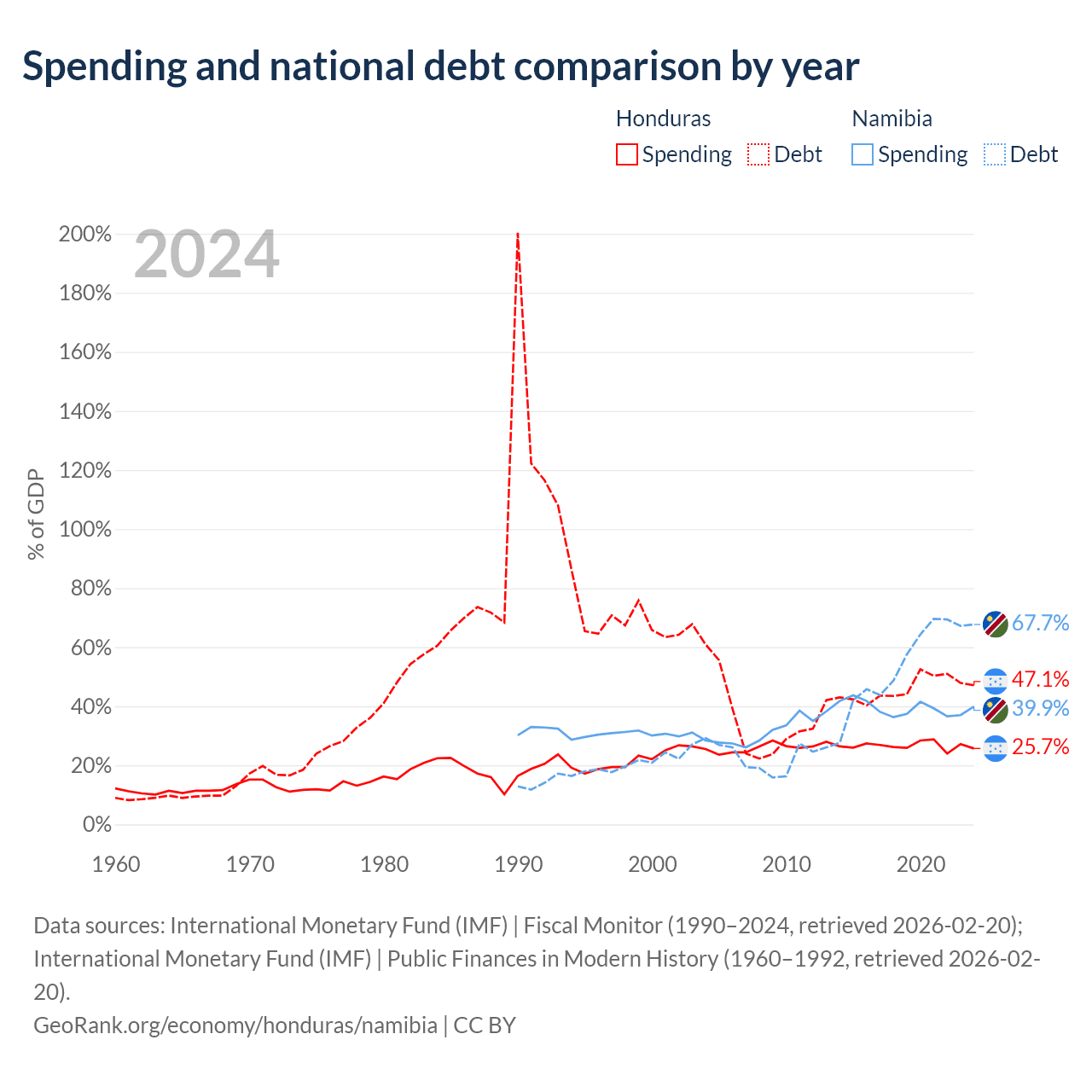 Honduras has $17.5B in government debt (47.1% of GDP), compared to $9.05B (67.7% of GDP) in Namibia.