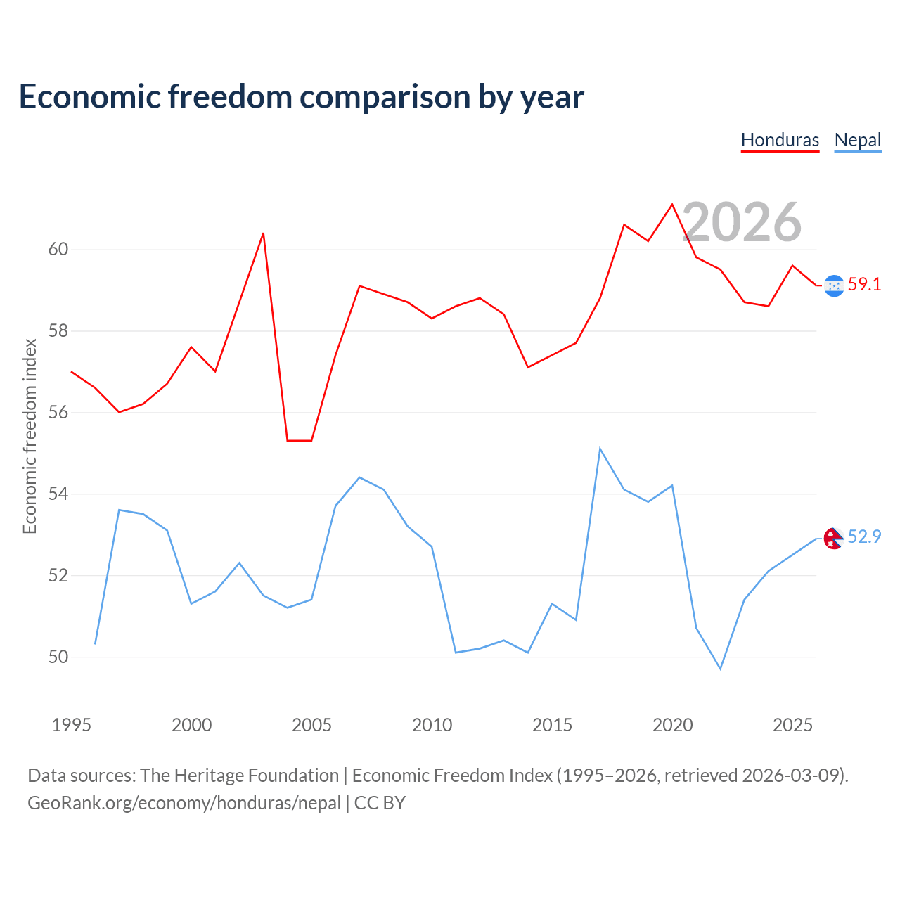 The Economic Freedom Index for Honduras is 59.1, ranking 105/197, compared to 52.9 for Nepal, ranking 144/197. The chart above displays a comparison of annual changes in economic freedom indexes.