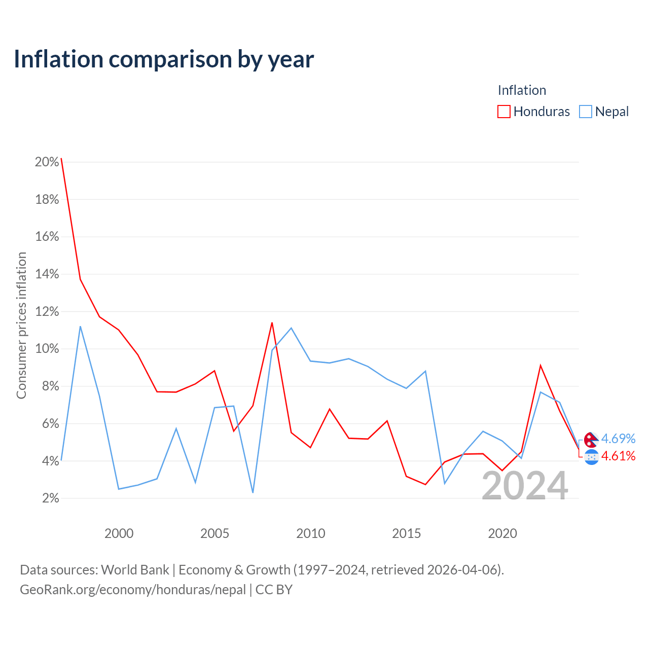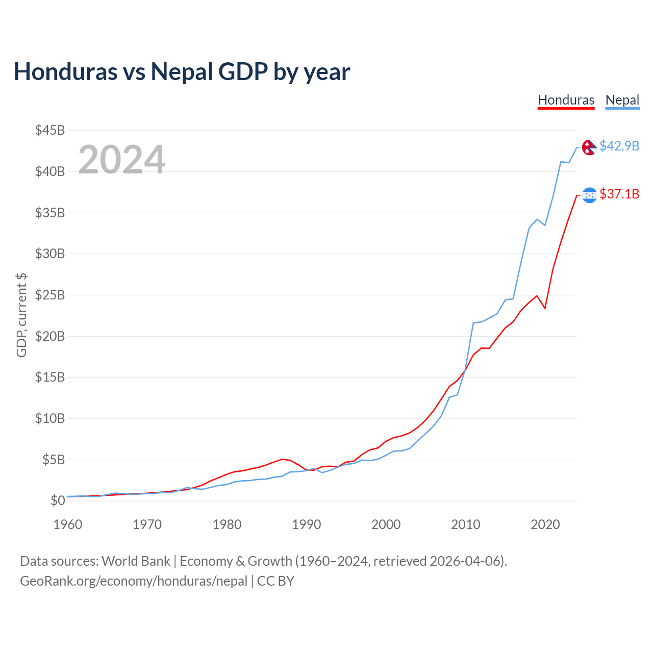 Honduras has a GDP of $37.1B compared to $42.9B for Nepal, ranking 104/197 and 101/197 by economy size, respectively.