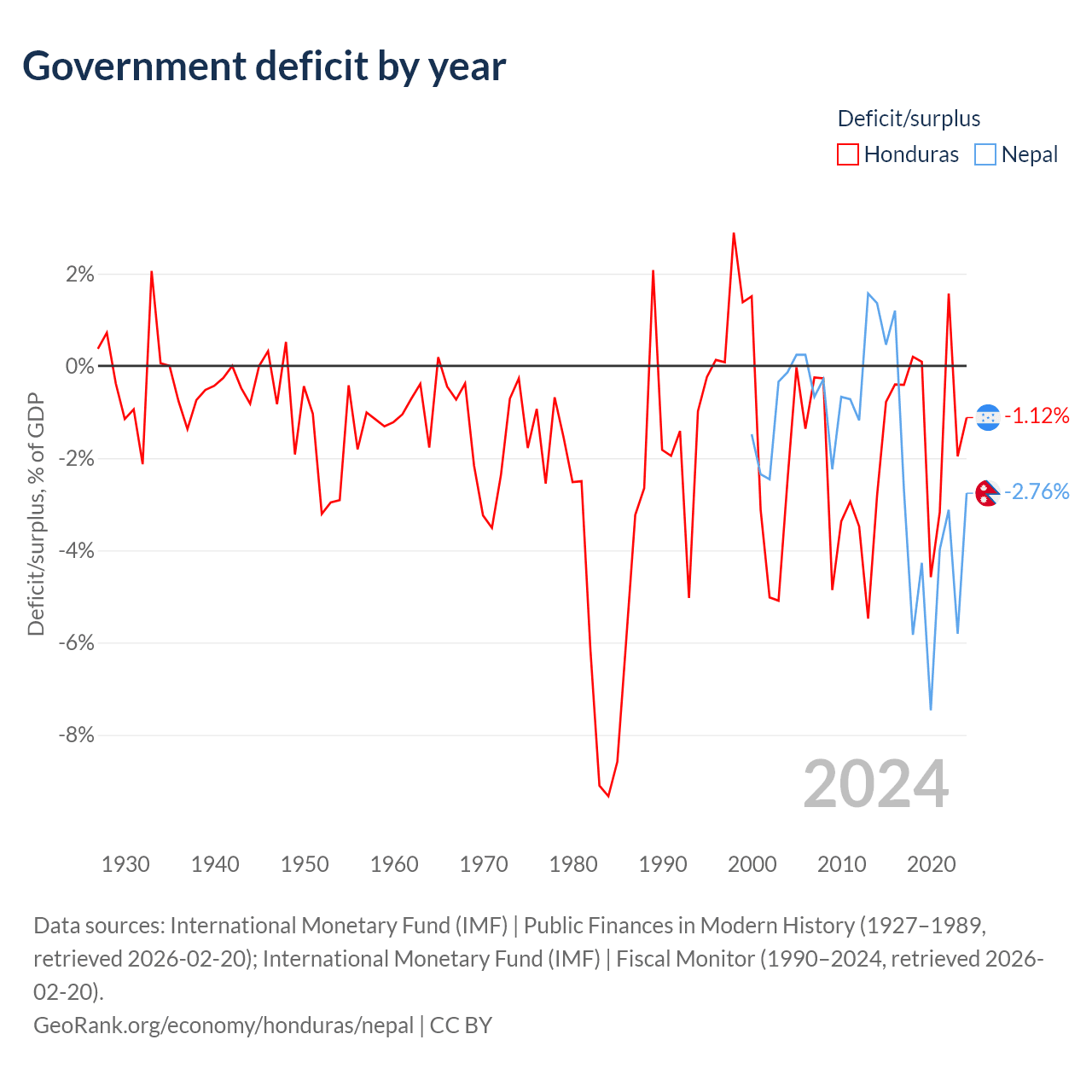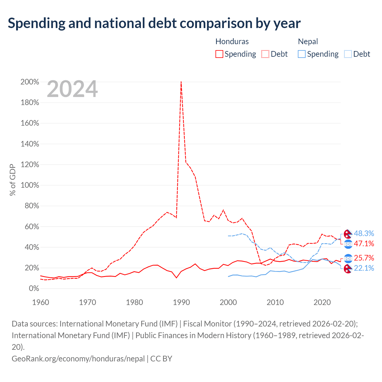 Honduras has $17.5B in government debt (47.1% of GDP), compared to $20.7B (48.3% of GDP) in Nepal.