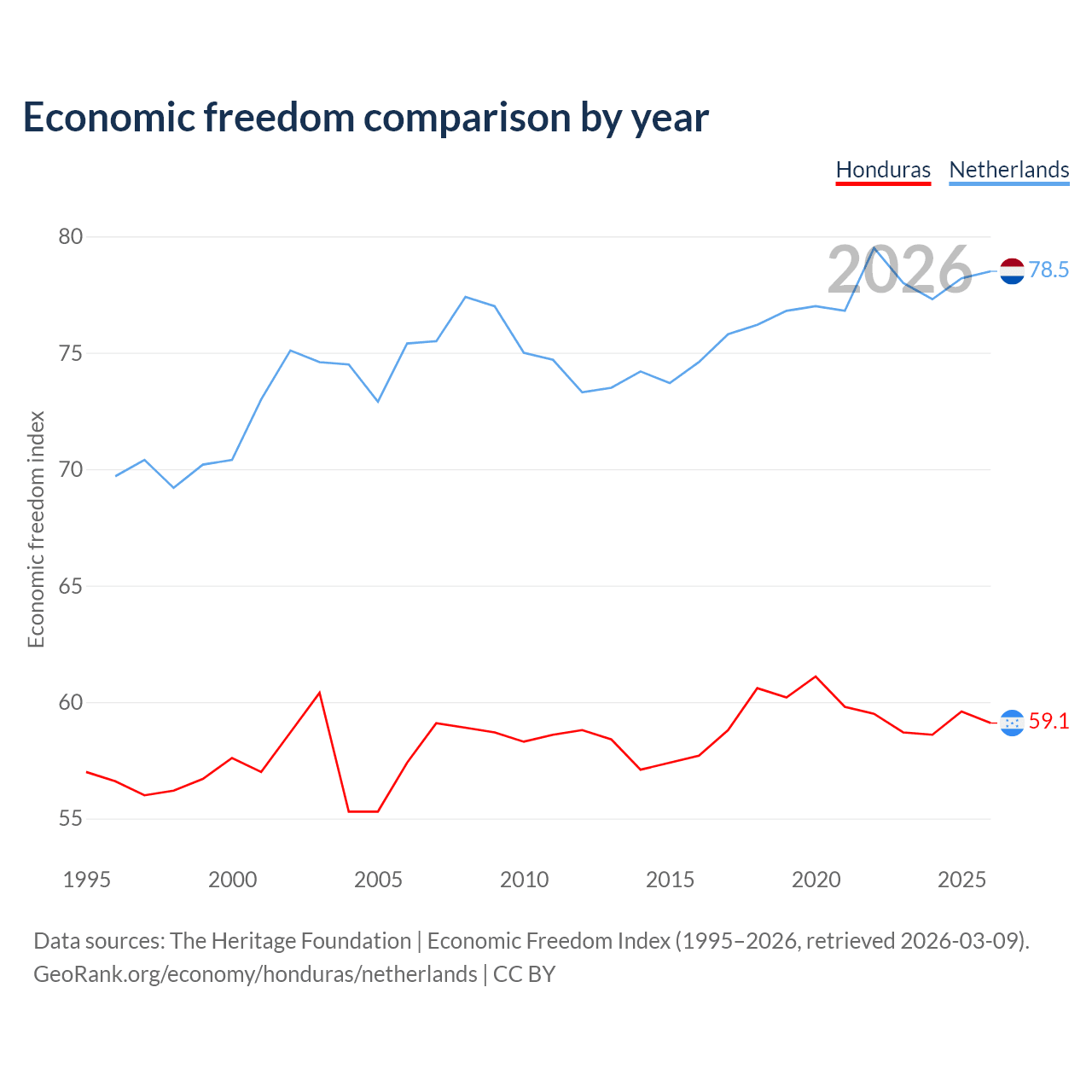 The Economic Freedom Index for Honduras is 59.1, ranking 105/197, compared to 78.5 for the Netherlands, ranking 11/197. The chart above displays a comparison of annual changes in economic freedom indexes.