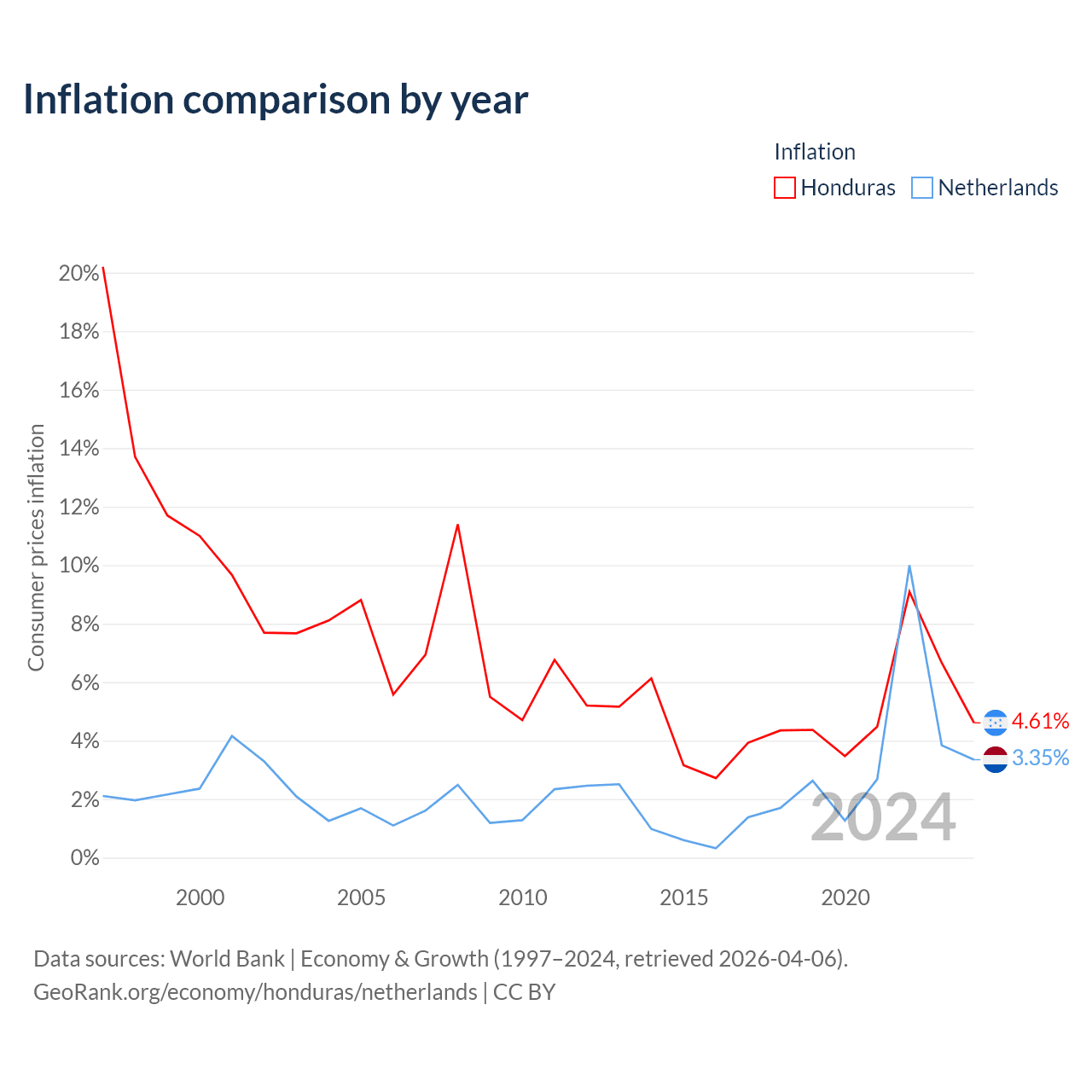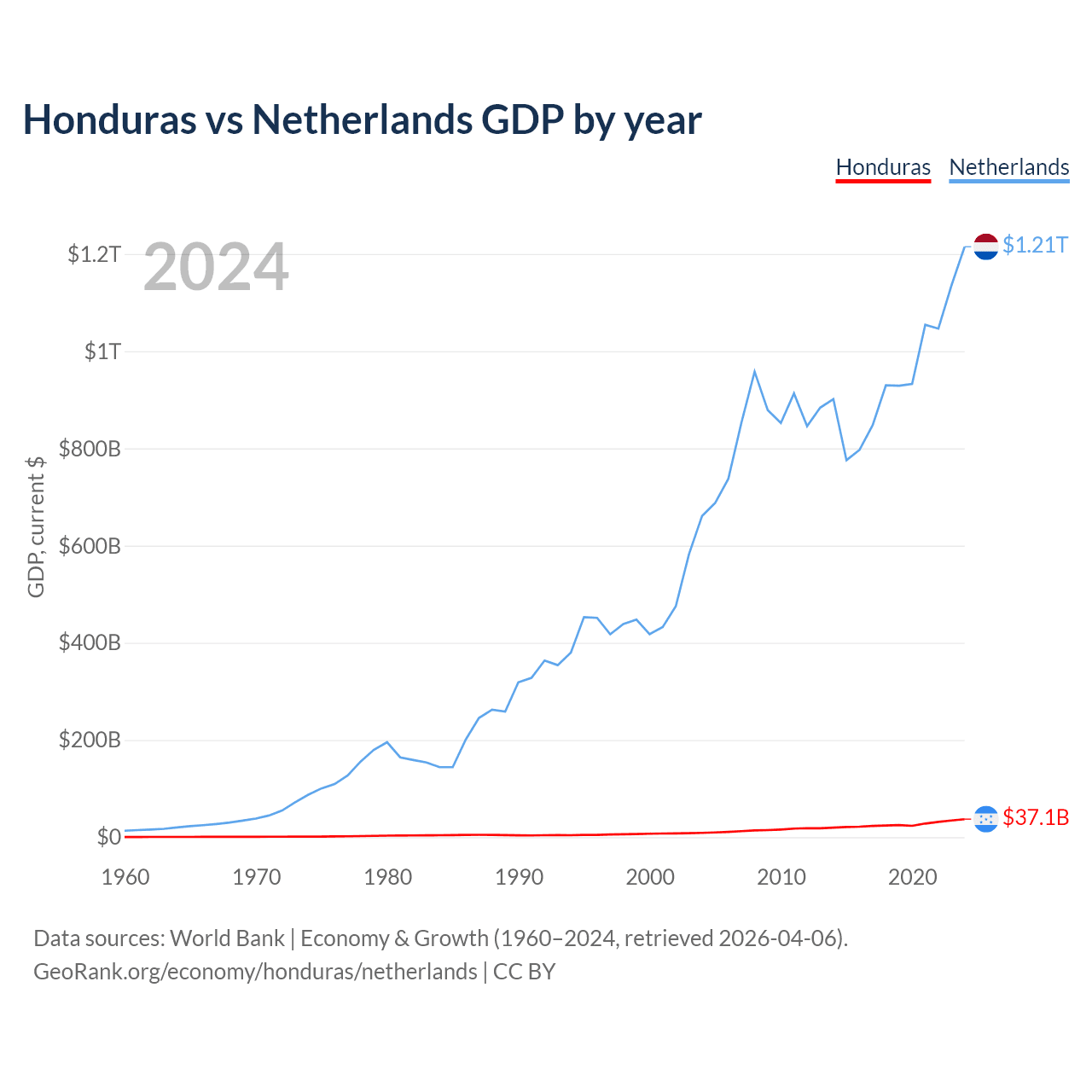 Honduras has a GDP of $37.1B compared to $1.21T for the Netherlands, ranking 104/197 and 19/197 by economy size, respectively.