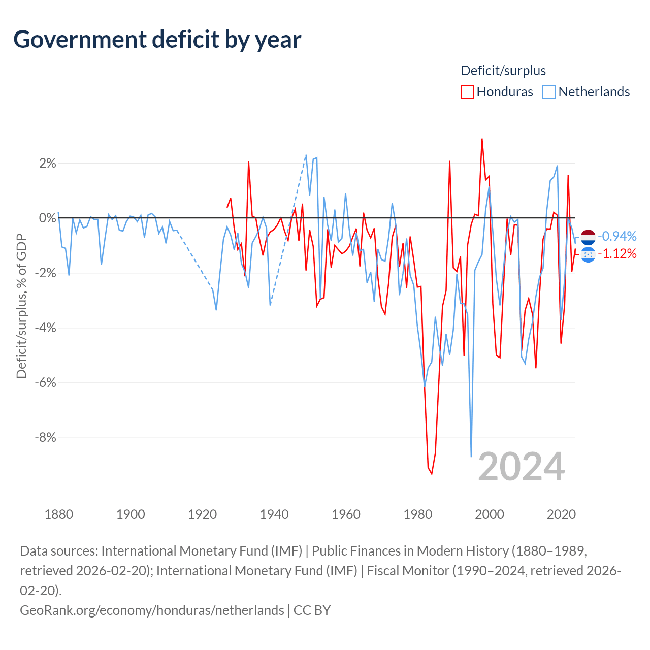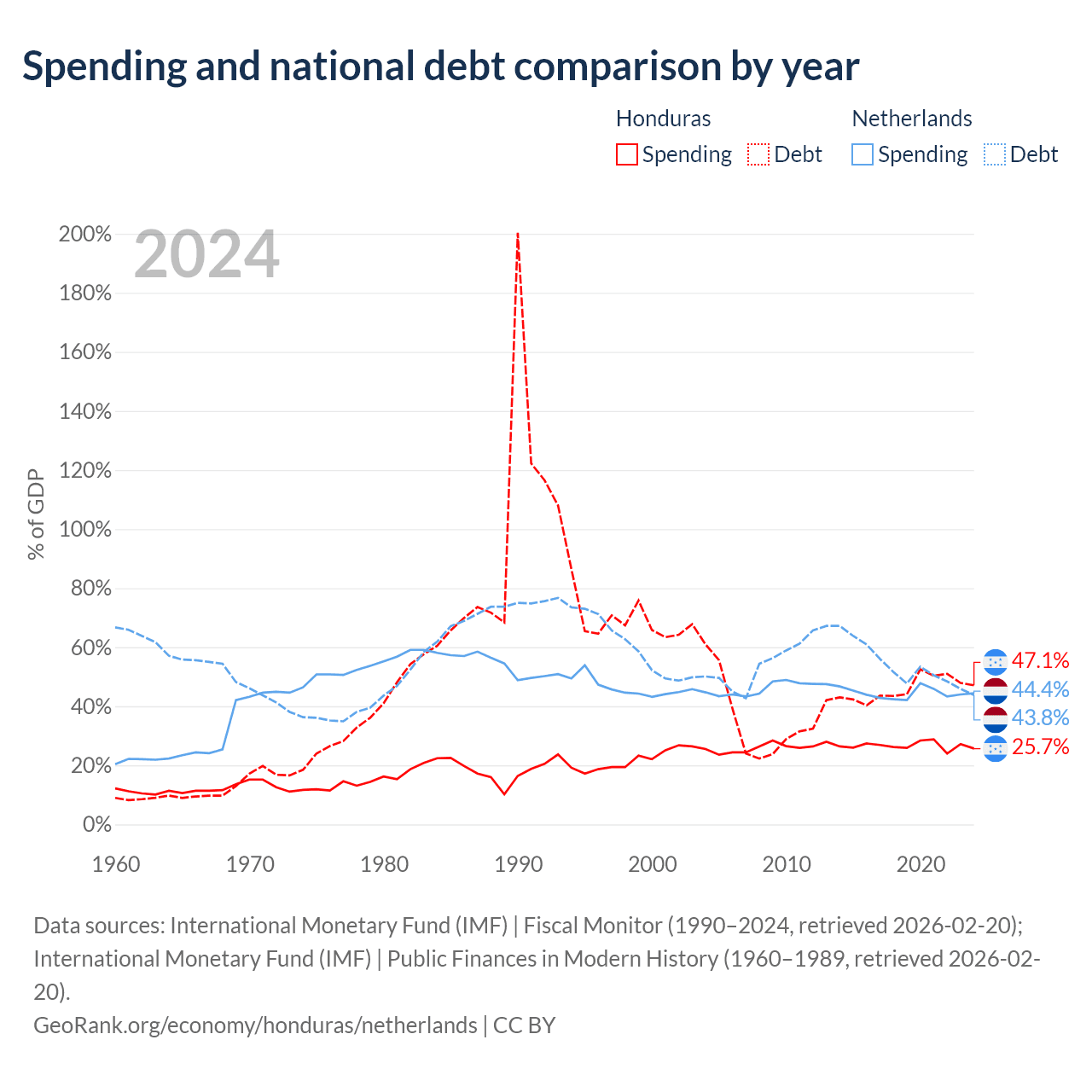 Honduras has $17.5B in government debt (47.1% of GDP), compared to $532B (43.8% of GDP) in the Netherlands.