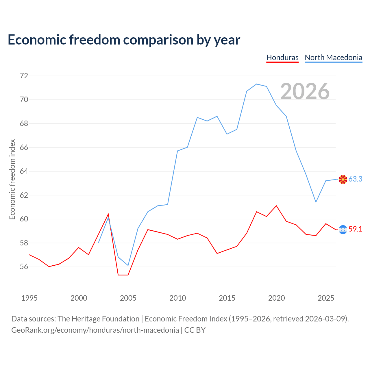 The Economic Freedom Index for Honduras is 59.1, ranking 105/197, compared to 63.3 for North Macedonia, ranking 81/197. The chart above displays a comparison of annual changes in economic freedom indexes.