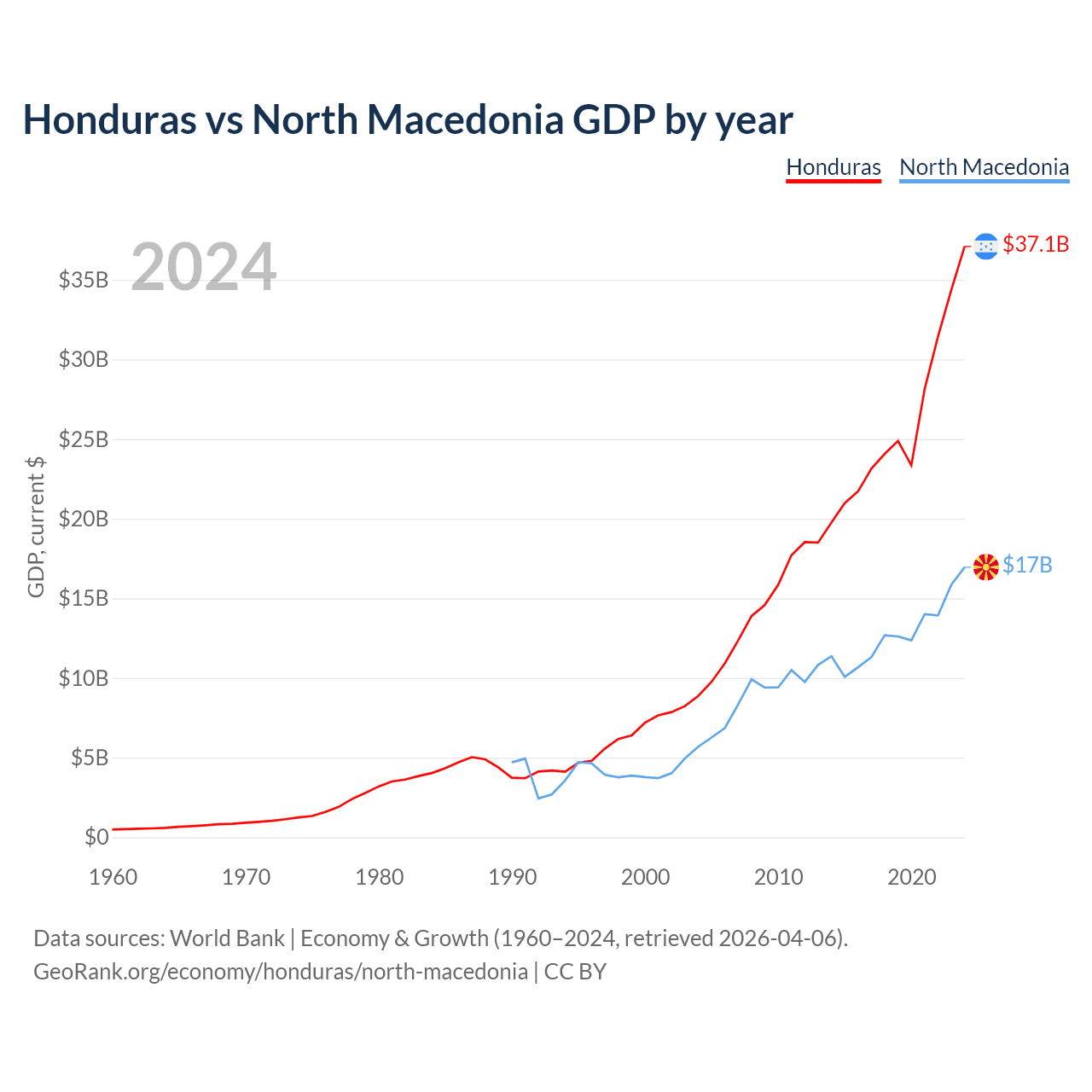 Honduras has a GDP of $37.1B compared to $17B for North Macedonia, ranking 104/197 and 138/197 by economy size, respectively.