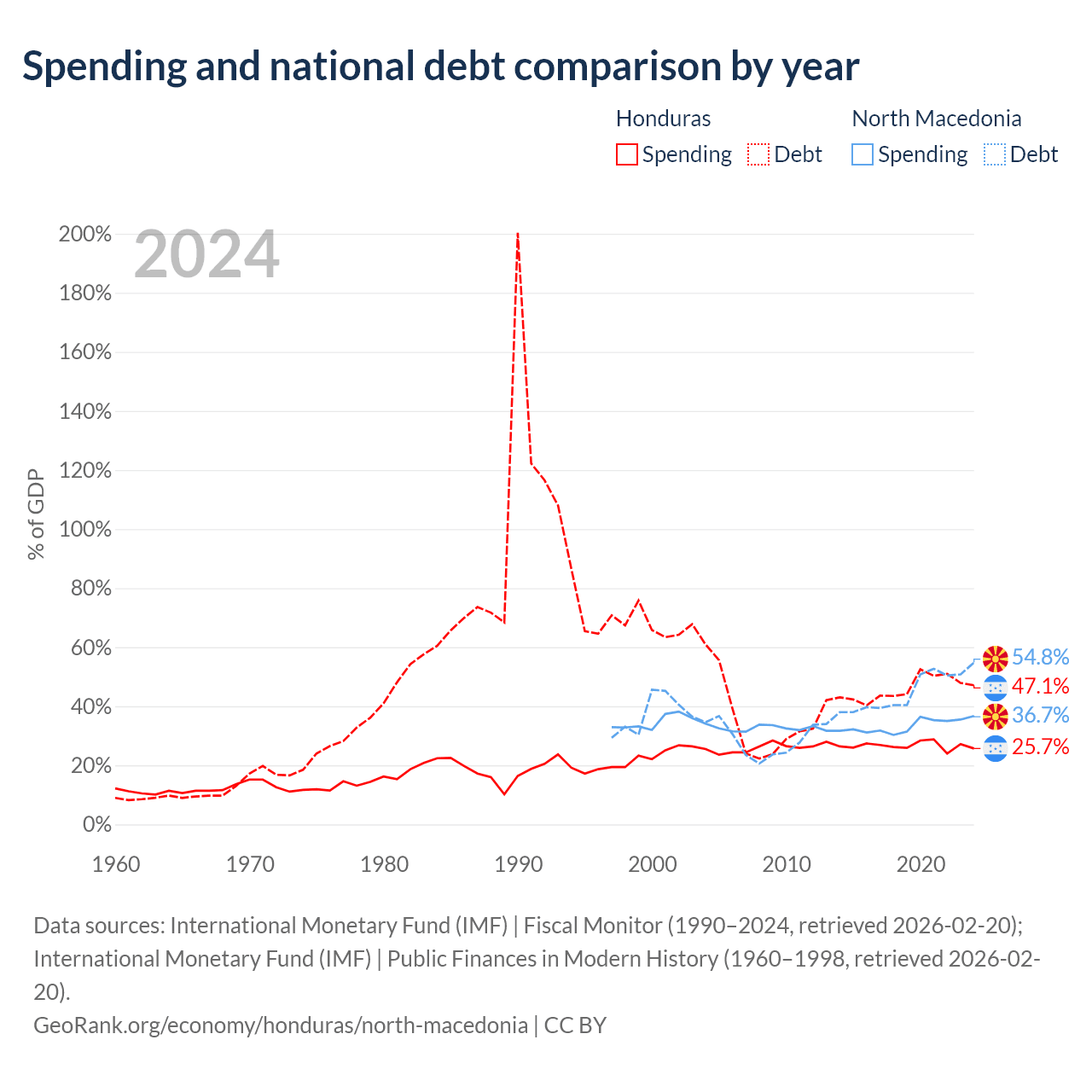 Honduras has $17.5B in government debt (47.1% of GDP), compared to $9.3B (54.8% of GDP) in North Macedonia.