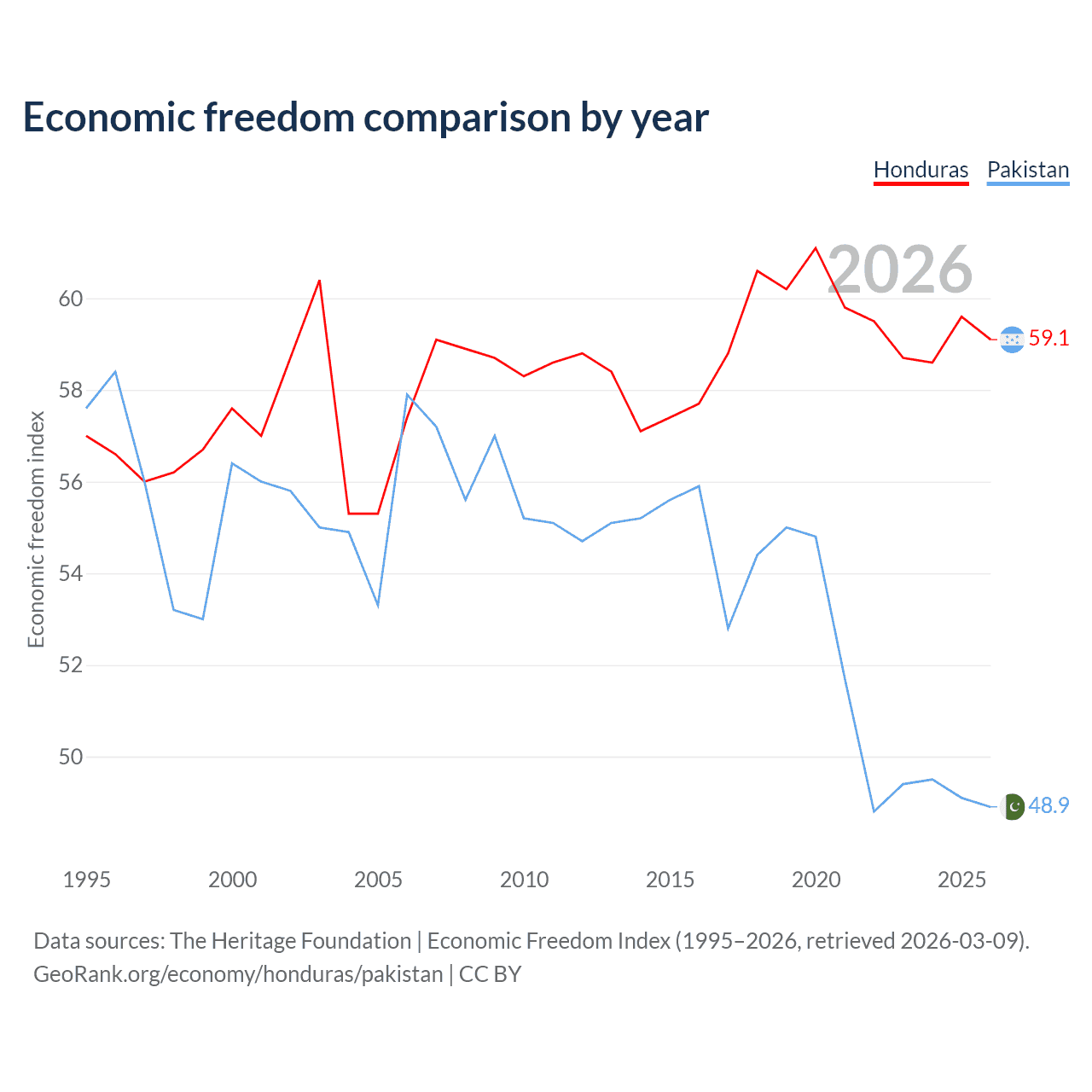 The Economic Freedom Index for Honduras is 59.1, ranking 105/197, compared to 48.9 for Pakistan, ranking 168/197. The chart above displays a comparison of annual changes in economic freedom indexes.