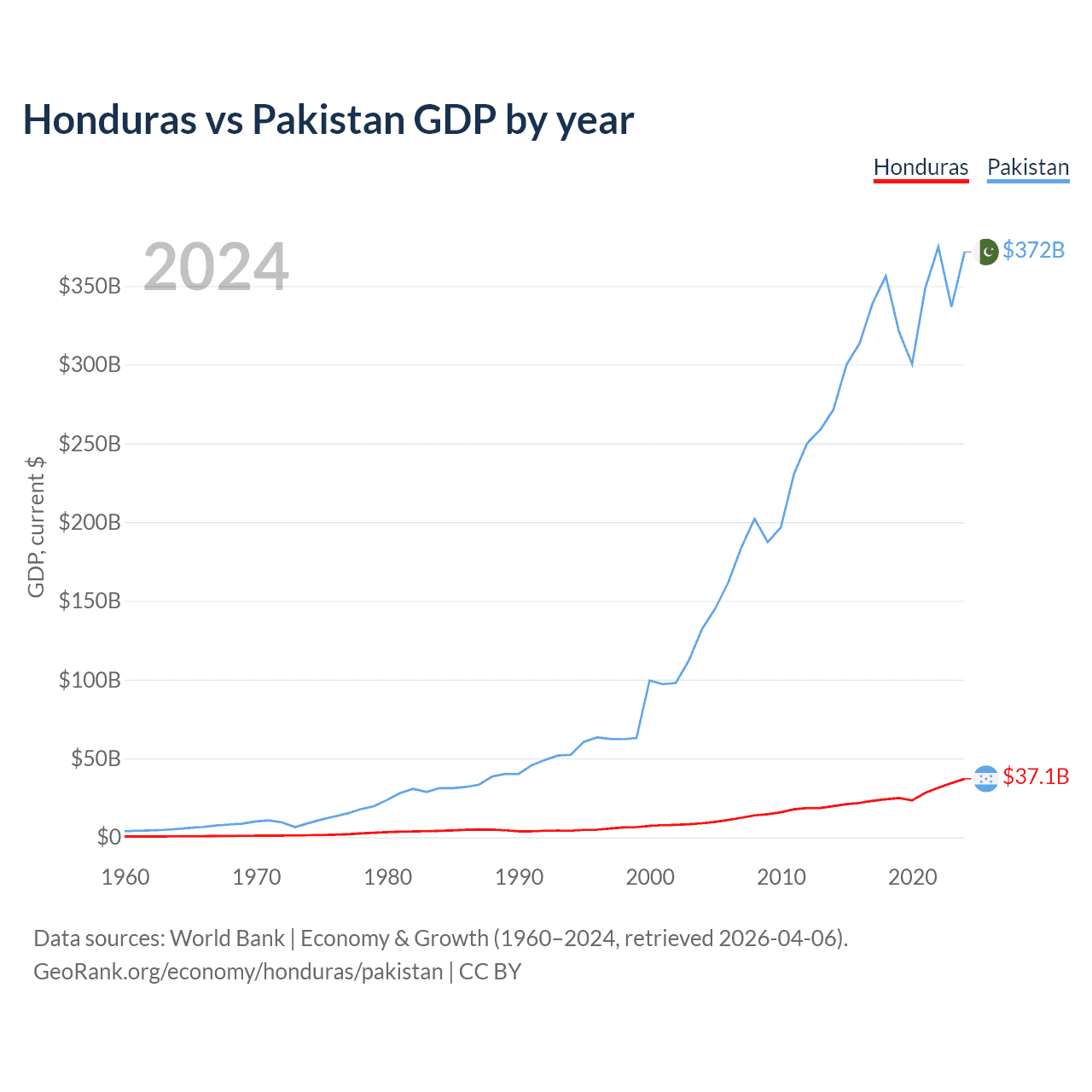 Honduras has a GDP of $37.1B compared to $372B for Pakistan, ranking 104/197 and 43/197 by economy size, respectively.