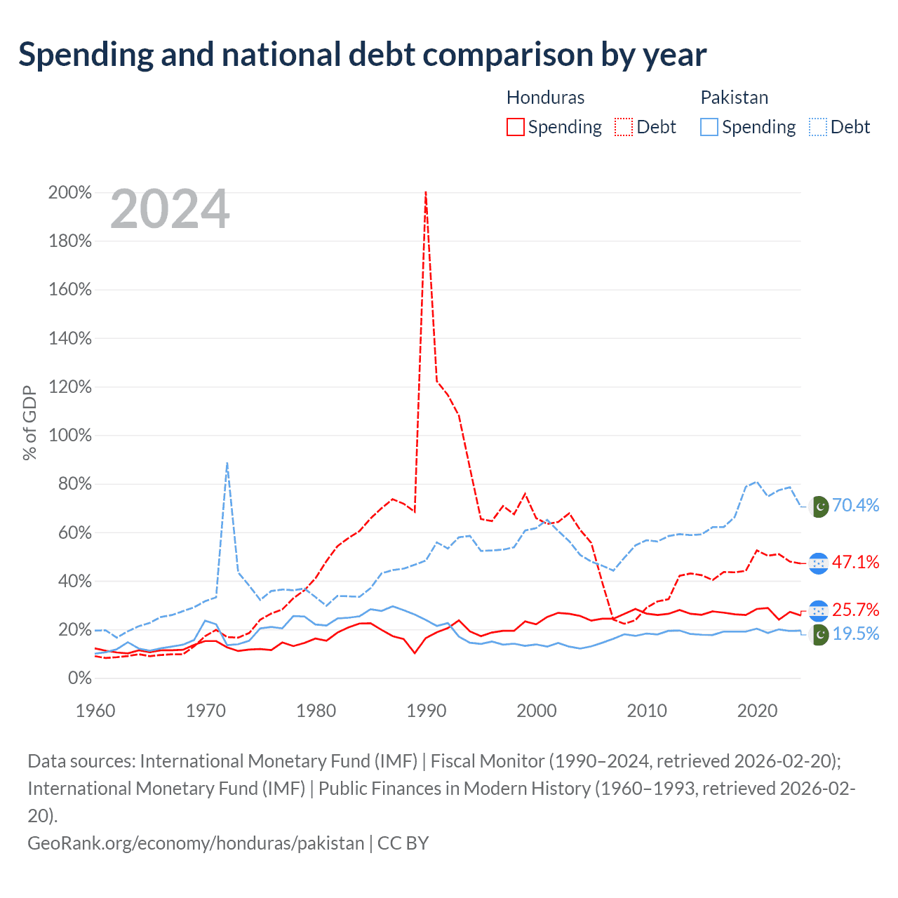 Honduras has $17.5B in government debt (47.1% of GDP), compared to $262B (70.4% of GDP) in Pakistan.
