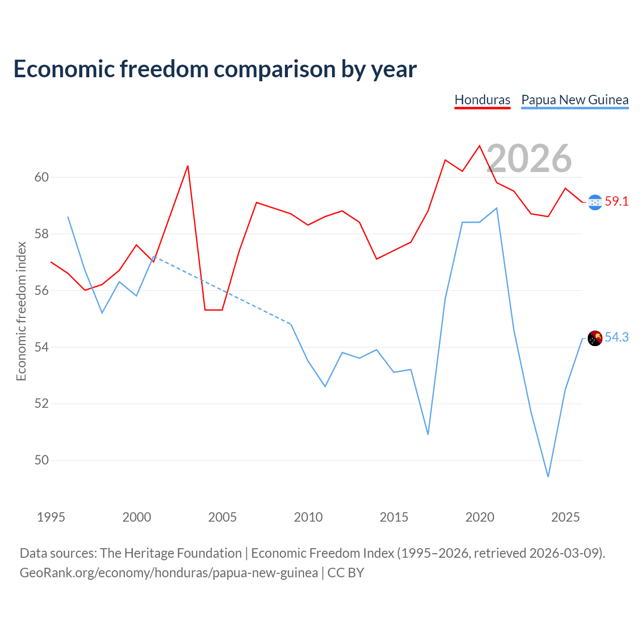 The Economic Freedom Index for Honduras is 59.1, ranking 105/197, compared to 54.3 for Papua New Guinea, ranking 134/197. The chart above displays a comparison of annual changes in economic freedom indexes.