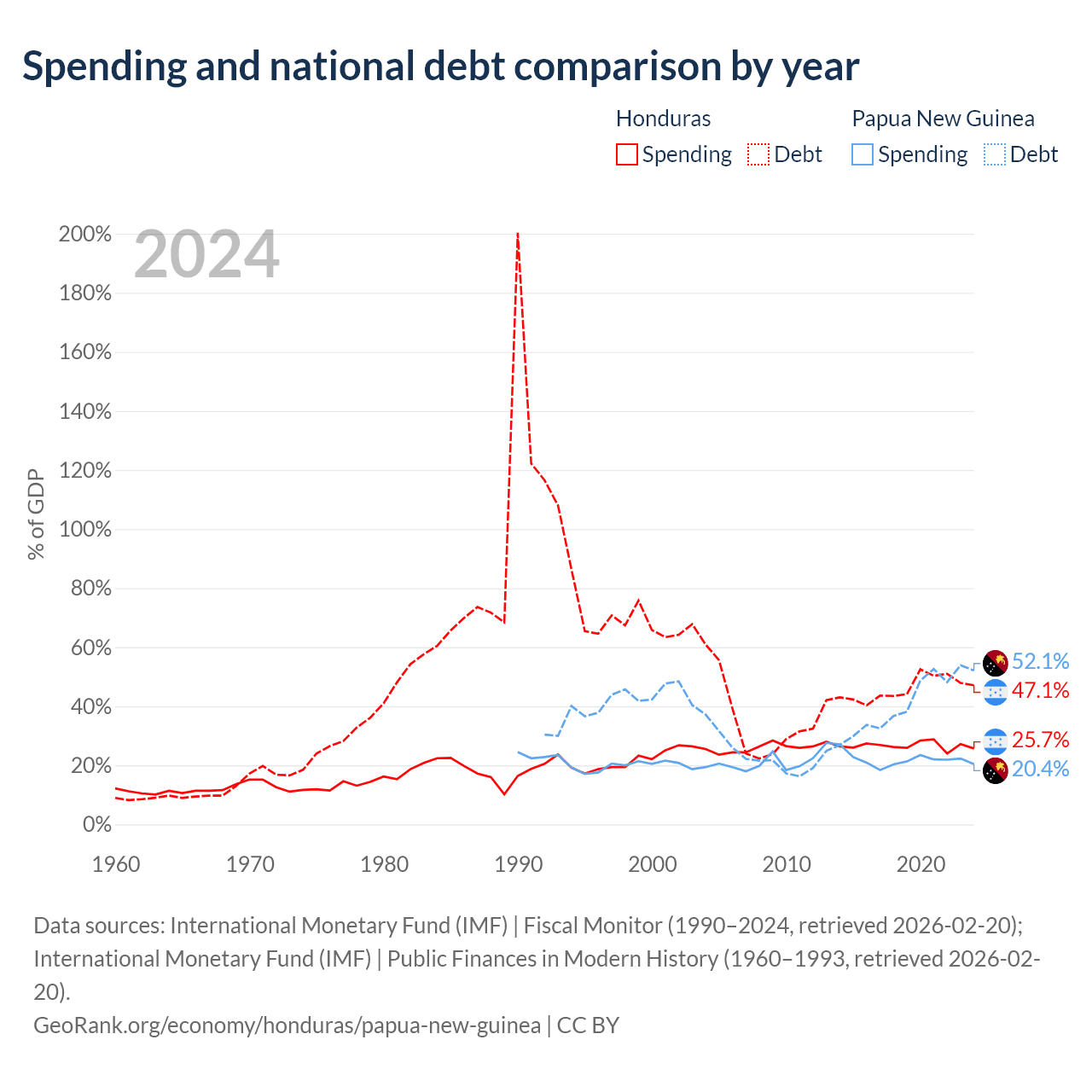 Honduras has $17.5B in government debt (47.1% of GDP), compared to $16.6B (52.1% of GDP) in Papua New Guinea.
