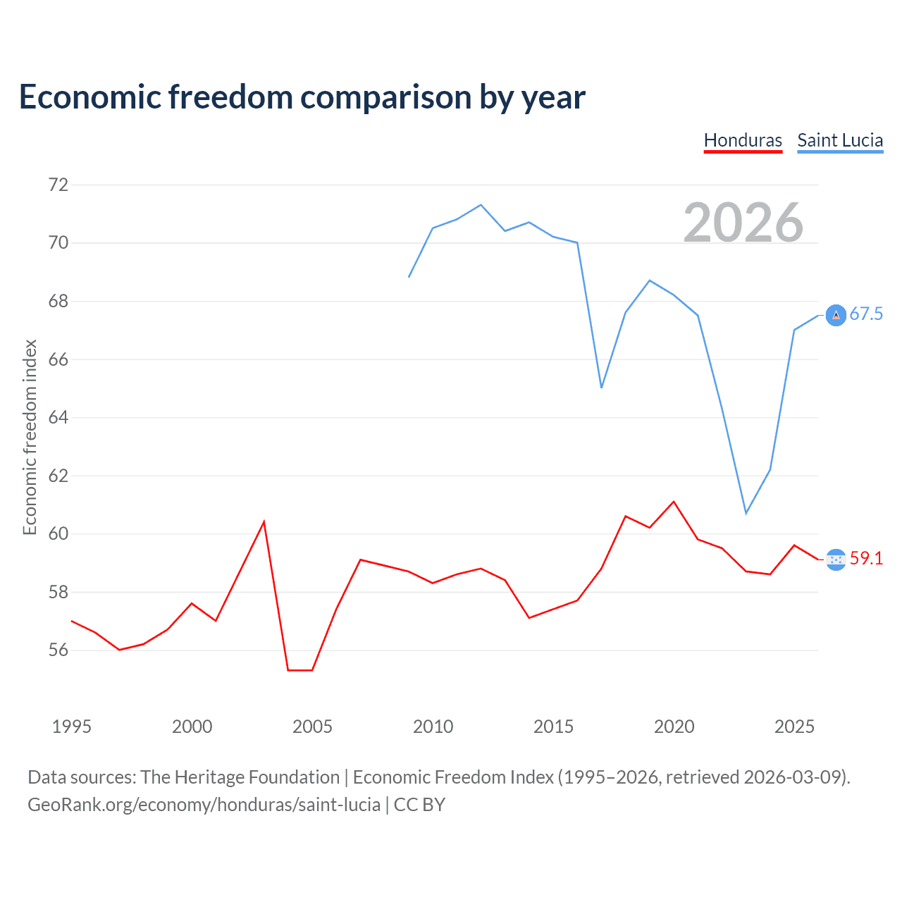 The Economic Freedom Index for Honduras is 59.1, ranking 105/197, compared to 67.5 for Saint Lucia, ranking 57/197. The chart above displays a comparison of annual changes in economic freedom indexes.