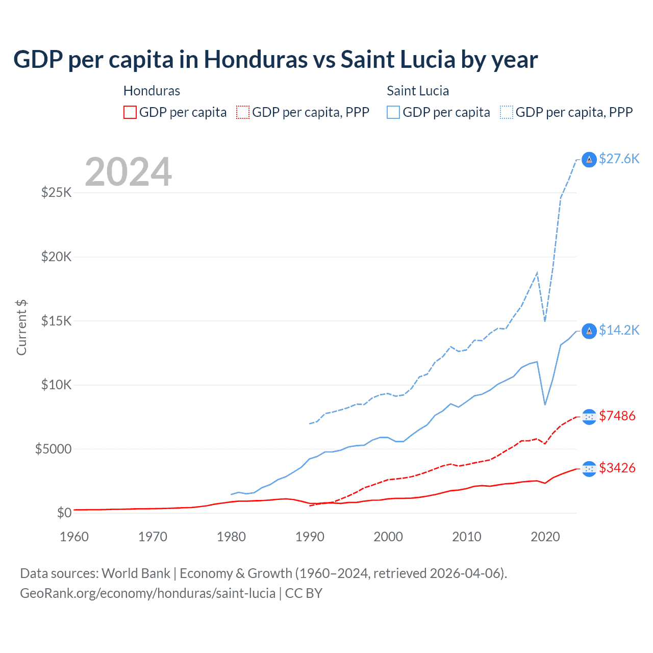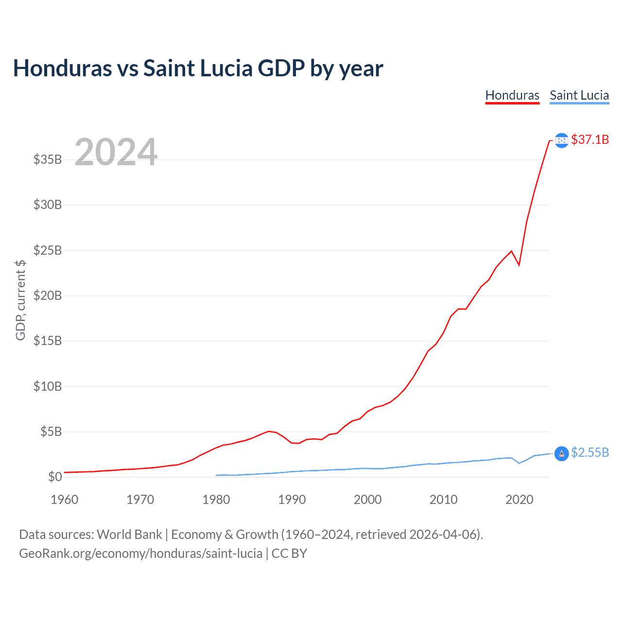 Honduras has a GDP of $37.1B compared to $2.55B for Saint Lucia, ranking 104/197 and 173/197 by economy size, respectively.