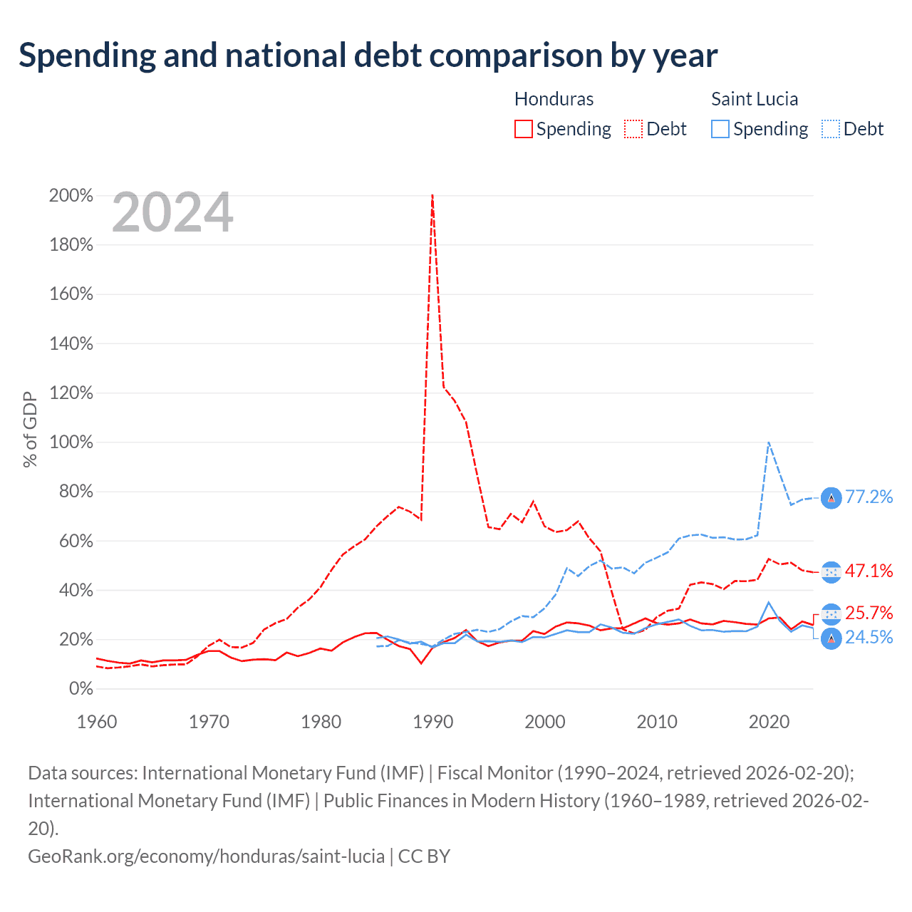 Honduras has $17.5B in government debt (47.1% of GDP), compared to $1.97B (77.2% of GDP) in Saint Lucia.