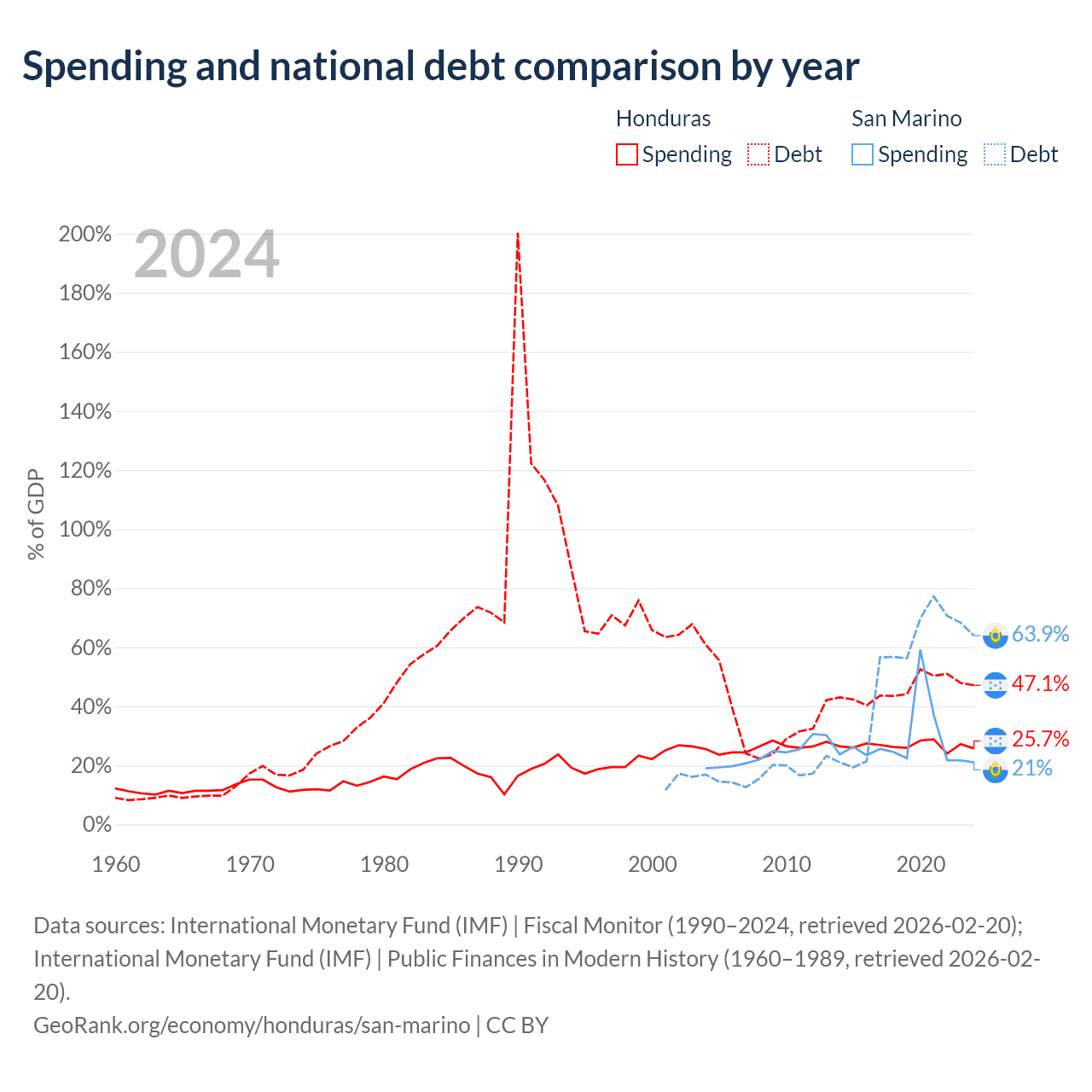 Honduras has $17.5B in government debt (47.1% of GDP), compared to $1.39B (63.9% of GDP) in San Marino.