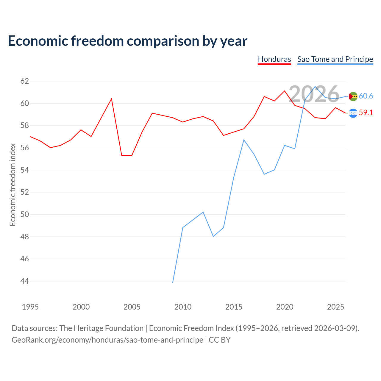 The Economic Freedom Index for Honduras is 59.1, ranking 105/197, compared to 60.6 for Sao Tome and Principe, ranking 93/197. The chart above displays a comparison of annual changes in economic freedom indexes.