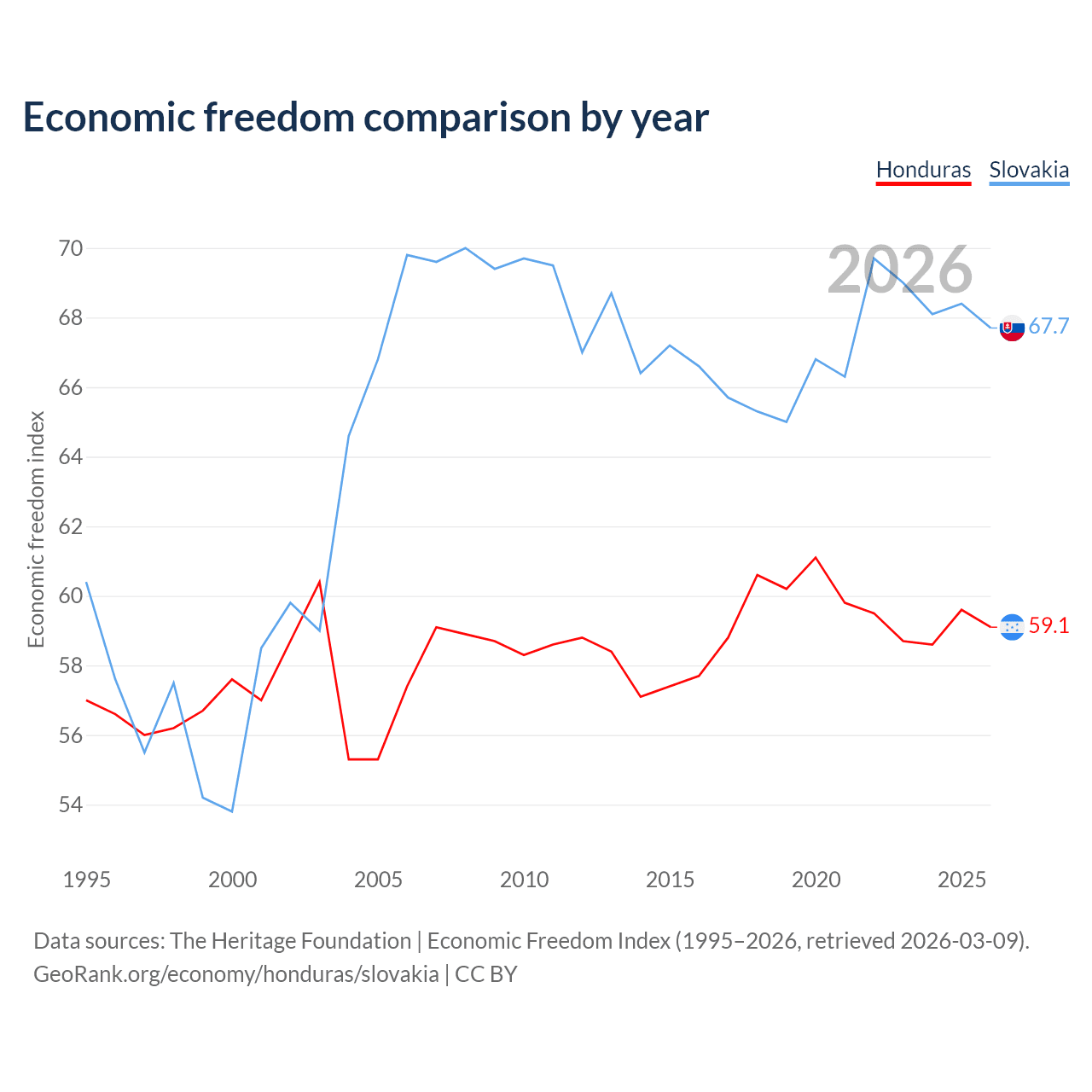 The Economic Freedom Index for Honduras is 59.1, ranking 105/197, compared to 67.7 for Slovakia, ranking 54/197. The chart above displays a comparison of annual changes in economic freedom indexes.
