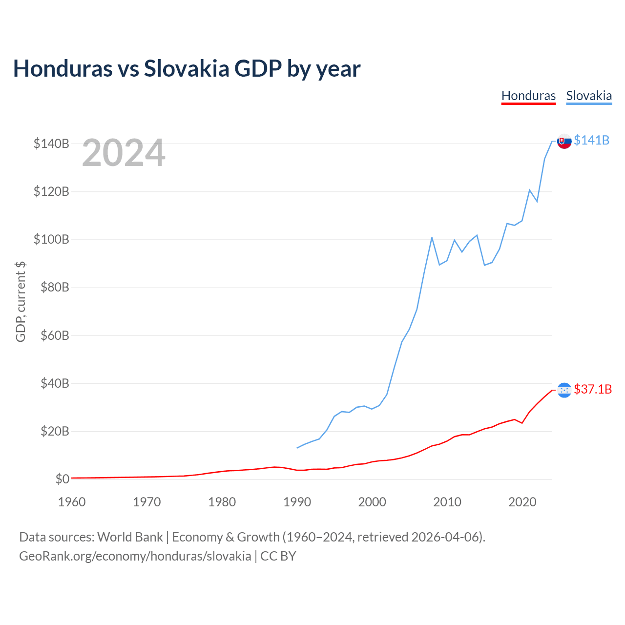 Honduras has a GDP of $37.1B compared to $141B for Slovakia, ranking 104/197 and 61/197 by economy size, respectively.