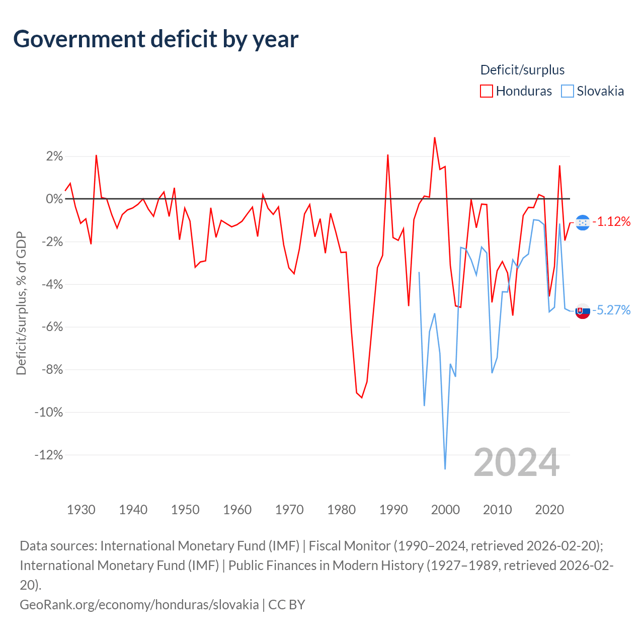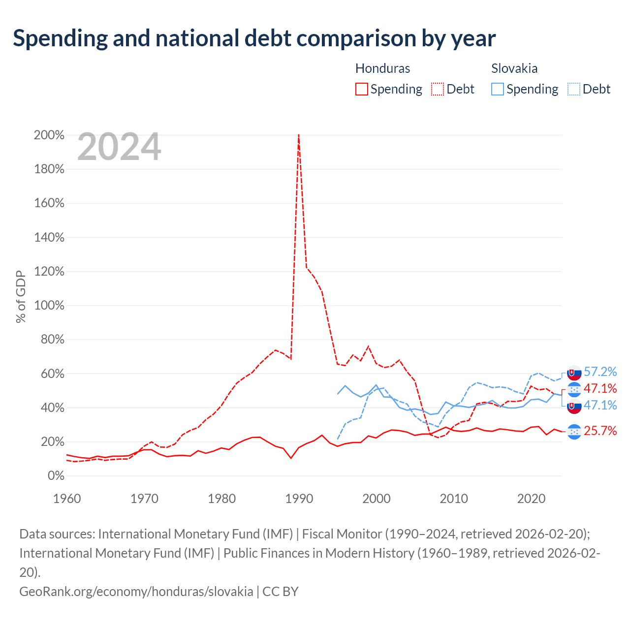 Honduras has $17.5B in government debt (47.1% of GDP), compared to $80.7B (57.2% of GDP) in Slovakia.