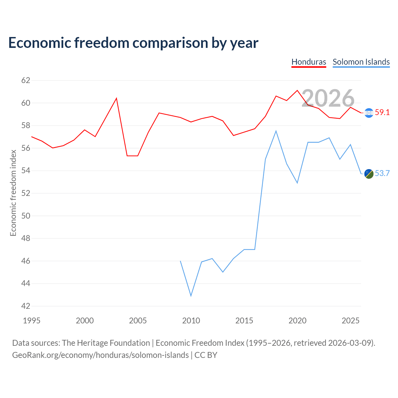 The Economic Freedom Index for Honduras is 59.1, ranking 105/197, compared to 53.7 for the Solomon Islands, ranking 137/197. The chart above displays a comparison of annual changes in economic freedom indexes.