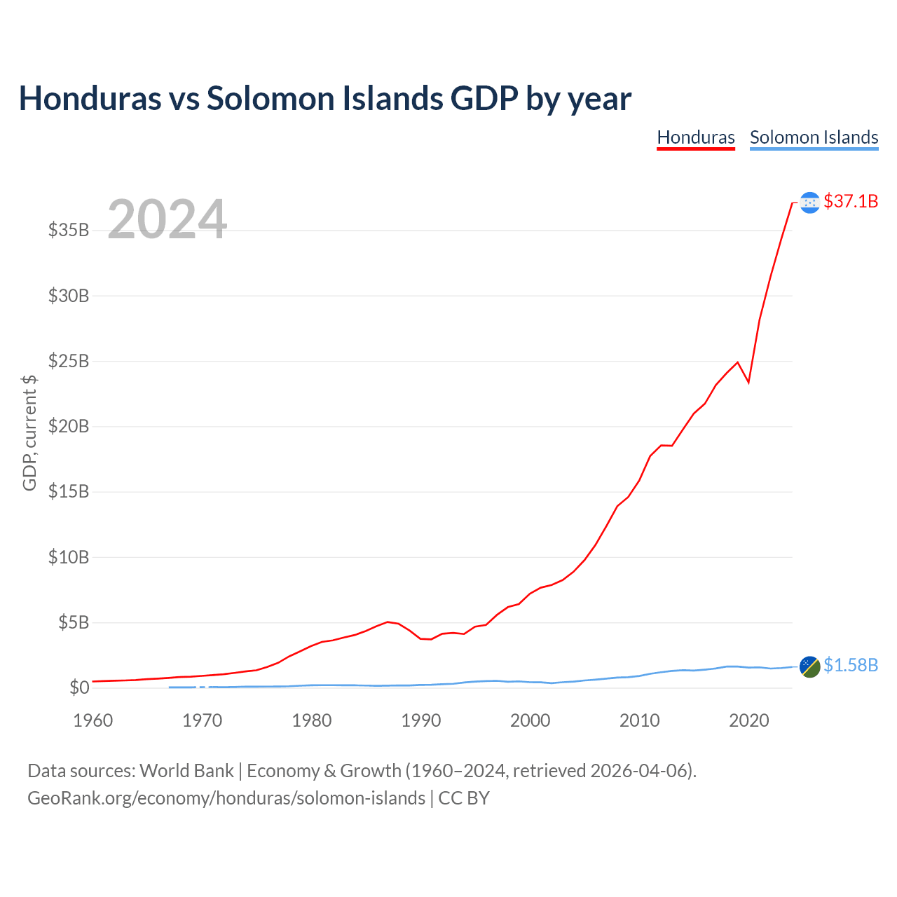 Honduras has a GDP of $37.1B compared to $1.58B for the Solomon Islands, ranking 104/197 and 182/197 by economy size, respectively.