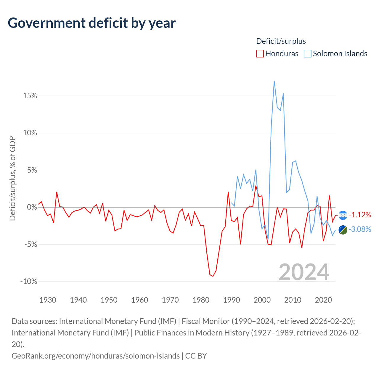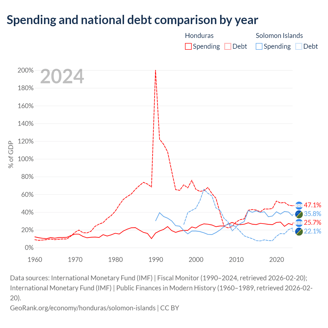Honduras has $17.5B in government debt (47.1% of GDP), compared to $350M (22.1% of GDP) in the Solomon Islands.