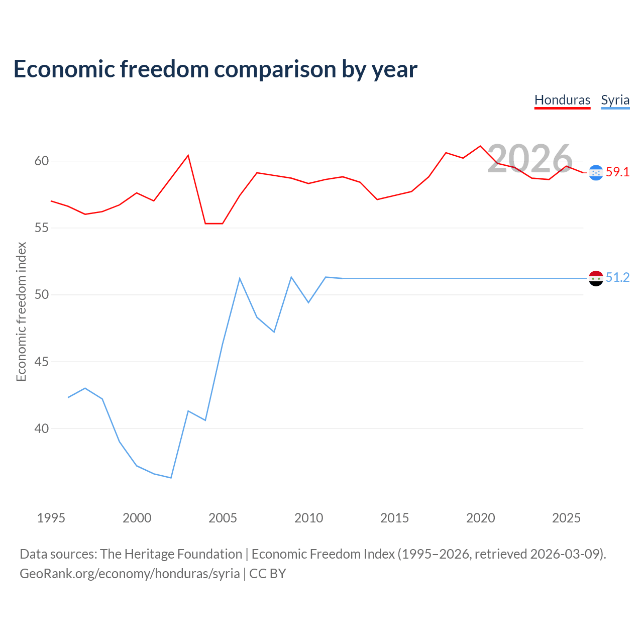 The Economic Freedom Index for Honduras is 59.1, ranking 105/197, compared to 51.2 for Syria, ranking 155/197. The chart above displays a comparison of annual changes in economic freedom indexes.