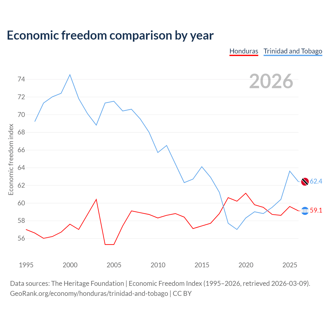 The Economic Freedom Index for Honduras is 59.1, ranking 105/197, compared to 62.4 for Trinidad and Tobago, ranking 87/197. The chart above displays a comparison of annual changes in economic freedom indexes.