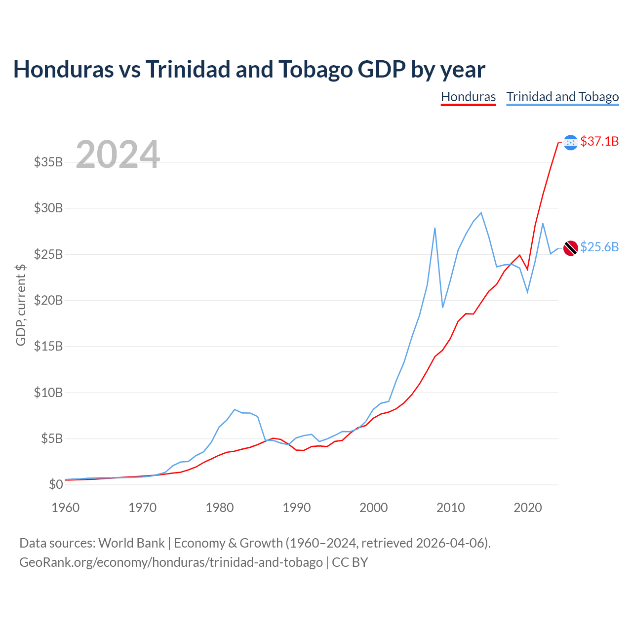 Honduras has a GDP of $37.1B compared to $25.6B for Trinidad and Tobago, ranking 104/197 and 115/197 by economy size, respectively.