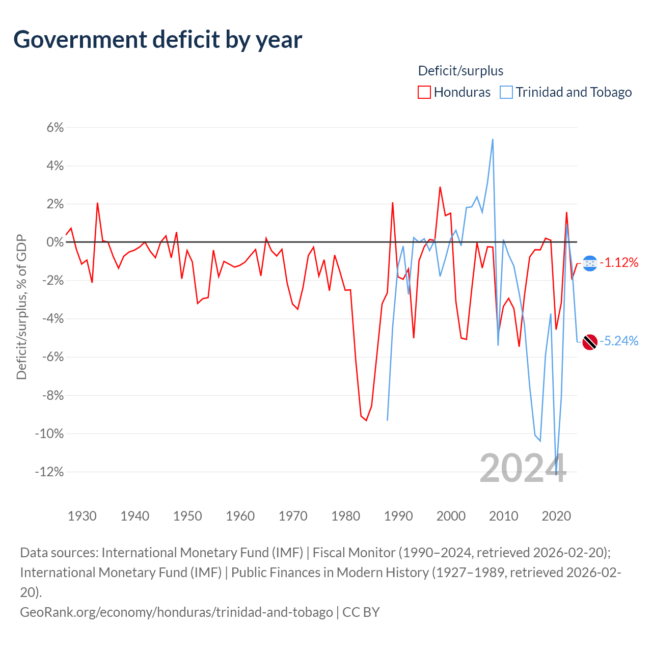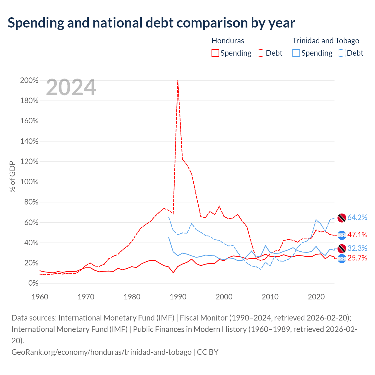 Honduras has $17.5B in government debt (47.1% of GDP), compared to $16.5B (64.2% of GDP) in Trinidad and Tobago.