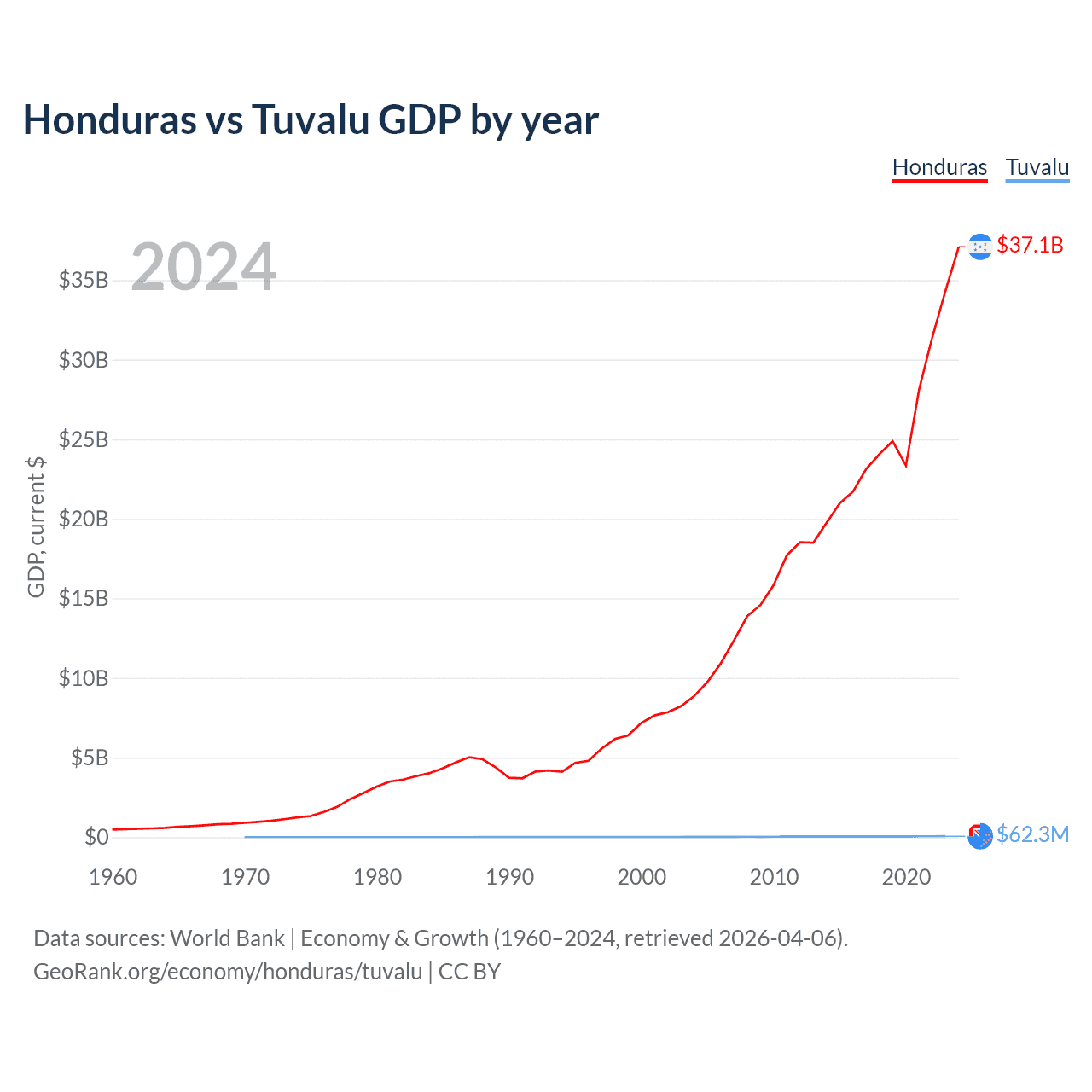 Honduras has a GDP of $37.1B compared to $62.3M for Tuvalu, ranking 104/197 and 196/197 by economy size, respectively.